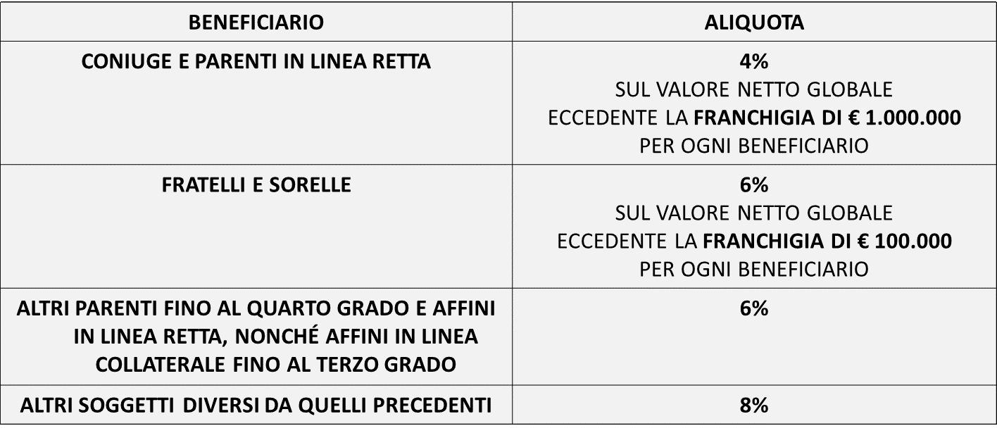 Per quel che concerne la concreta applicazione dell’imposta, per stabilire le franchigie e le aliquote da utilizzare, bisogna guardare al rapporto di parentela esistente tra il disponente (o l’apportatore) e i beneficiari del fondo in trust (non rileva quindi la figure del trustee, sebbene sia questi il soggetto al quale i beni, materialmente, vengono trasferiti).