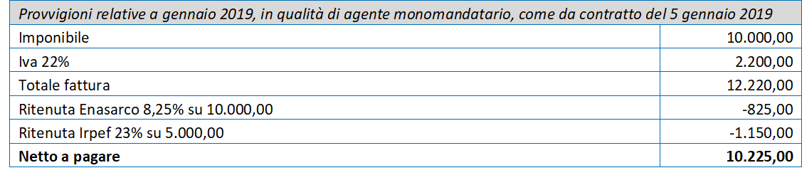 Alla luce di quanto sopra, andiamo quindi a vedere come si presenterà la fattura (che si ricorda dovrà essere obbligatoriamente emessa in formato elettronico e transitare dal Sistema di Interscambio dell’Agenzia delle Entrate, ad eccezione dei casi di esonero previsti per i contribuenti in regime forfettario o di vantaggio) di un agente di commercio, che non ha diritto alla riduzione della ritenuta Irpef, in quanto non si avvale di collaboratori, per l’addebito di provvigioni maturate nel 2019: