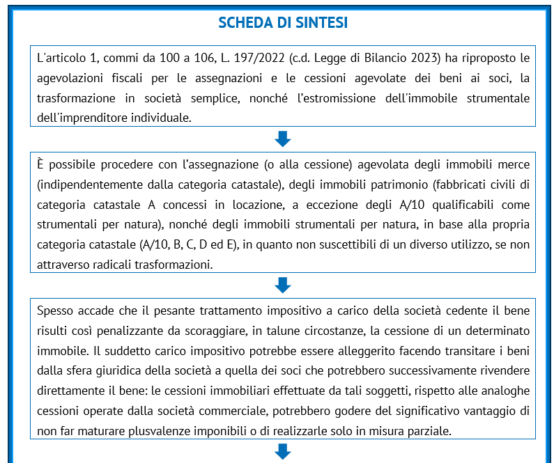 Nel prosieguo del presente intervento verrà esaminato l’istituto dell’assegnazione agevolata degli immobili ai soci e gli effetti fiscali della successiva cessione a terzi del fabbricato oggetto di assegnazione.