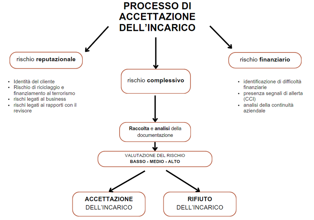 Tali due principi condizionano inevitabilmente l’approccio del revisore nel processo di accettazione o mantenimento dell’incarico, il quale può essere così riassunto in fasi: