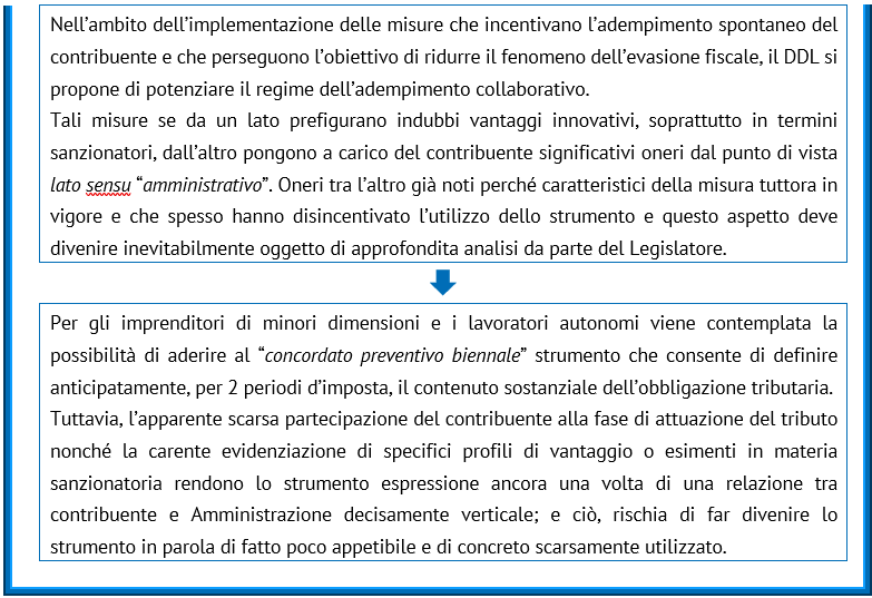 Nell’ambito dell’implementazione delle misure che incentivano l’adempimento spontaneo del contribuente e che perseguono l’obiettivo di ridurre il fenomeno dell’evasione fiscale, il DDL sviluppa la propria strategia su 2 distinti fronti: