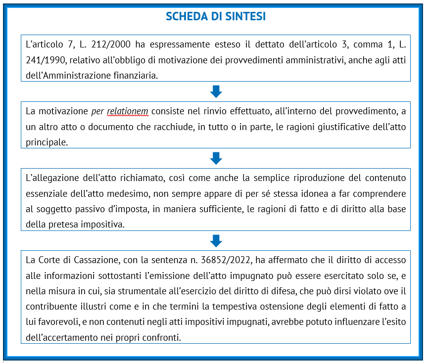 La motivazione per relationem, consistente nel rinvio effettuato, all’interno del provvedimento, a un altro atto o documento che racchiude, in tutto o in parte, le ragioni giustificative dell’atto principale ha trovato, come noto, nel diritto tributario diffusa disciplina positiva.