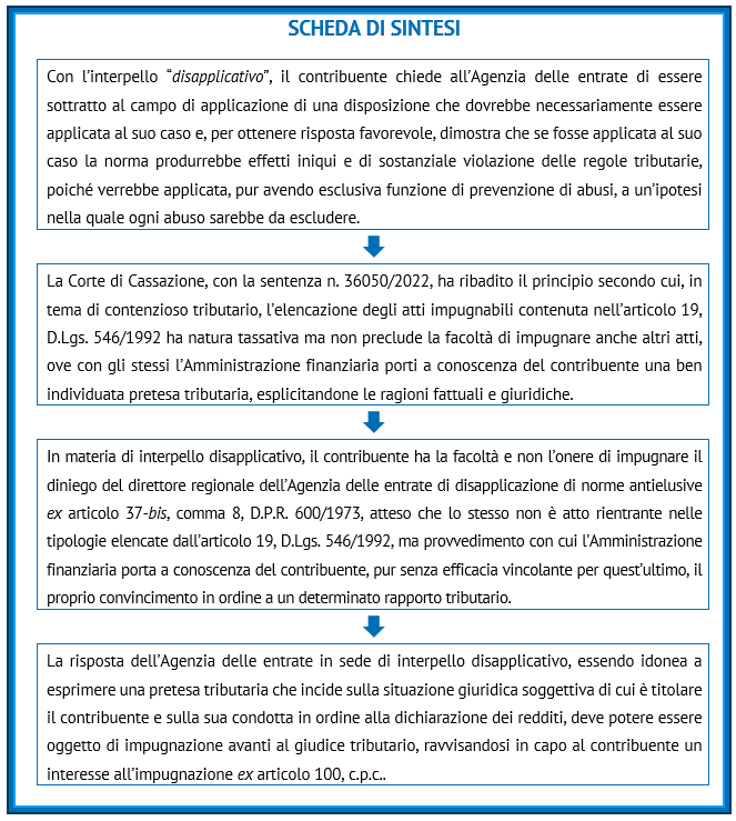 La Corte di Cassazione, con la sentenza n. 36050/2022, richiamando la sua consolidata giurisprudenza (Cassazione, sentenze n. 25281/2015, n. 13963/2017 e ordinanza n. 32425/2019), ha ribadito il principio già affermato dalla stessa Suprema Corte nella sentenza n. 17010/2012, secondo cui, in tema di contenzioso tributario, l’elencazione degli atti impugnabili contenuta nell’articolo 19, D.Lgs. 546/1992 ha natura tassativa ma non preclude la facoltà di impugnare anche altri atti, ove con gli stessi l’Amministrazione finanziaria porti a conoscenza del contribuente una ben individuata pretesa tributaria, esplicitandone le ragioni fattuali e giuridiche, siccome è possibile un’interpretazione estensiva delle disposizioni in materia in ossequio alle norme costituzionali di tutela del contribuente (articoli 24 e 53, Costituzione) e di buon andamento dell’Amministrazione (articolo 97, Costituzione) e in considerazione dell’allargamento della giurisdizione tributaria operato con la L. 448/2001. Da ciò consegue che, in materia di interpello disapplicativo, il contribuente ha la facoltà e non l’onere di impugnare il diniego del direttore regionale dell’Agenzia delle entrate di disapplicazione di norme antielusive ex articolo 37-bis, comma 8, D.P.R. 600/1973, atteso che lo stesso non è atto rientrante nelle tipologie elencate dall’articolo 19, D.Lgs. 546/1992 ma provvedimento con cui l’Amministrazione finanziaria porta a conoscenza del contribuente, pur senza efficacia vincolante per il contribuente stesso, il proprio convincimento in ordine a un determinato rapporto tributario. Pertanto, la risposta dell’Agenzia delle entrate in sede di interpello c.d. “disapplicativo”, essendo idonea a esprimere una pretesa tributaria che incide sulla situazione giuridica soggettiva di cui è titolare il contribuente e sulla sua condotta in ordine alla dichiarazione dei redditi, deve potere essere oggetto di impugnazione avanti al giudice tributario, ravvisandosi, nel caso di specie, in capo al contribuente un interesse all’impugnazione ai sensi dell’articolo 100, c.p.c..