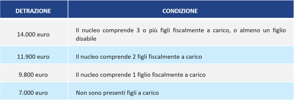 - 1, nell’ipotesi in cui, all’interno del nucleo familiare, siano presenti più di due figli considerati a carico (ossia che si trovano nelle condizioni previste dall’art. 12, comma 2, TUIR), ovvero almeno uno con disabilità accertata ai sensi dell’art. 3, Legge n. 104/1992, che si trovi nelle condizioni previste dall’art. 12, comma 2, TUIR.