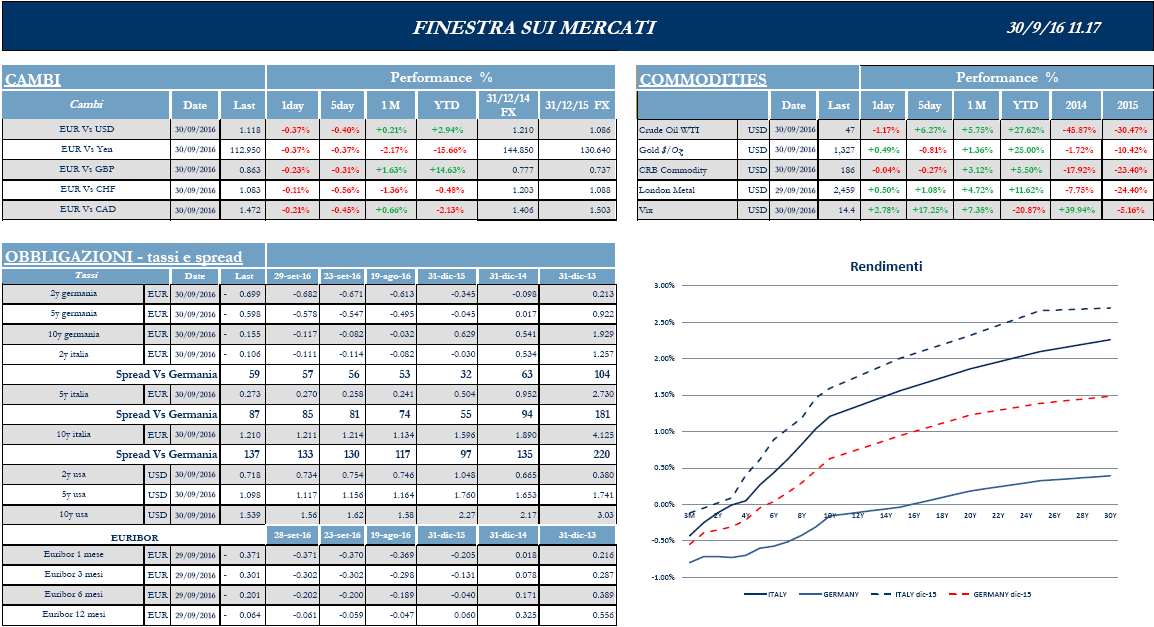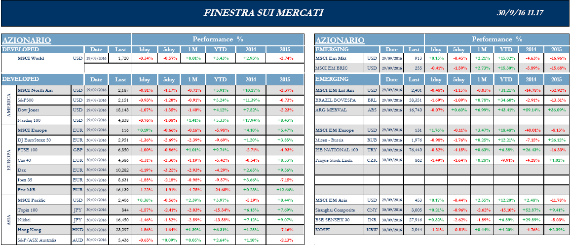 Settimana di mercati globali negativa, con il rally del petrolio che non è sufficiente a controbilanciare gli effetti sui listini delle tensioni politiche ed economiche del vecchio continente e il clima di incertezza dovuto all’approssimarsi delle elezioni presidenziali negli Stati Uniti. Se da una parte, infatti, al vertice di Algeri i paesi membri dell’Opec hanno trovato il primo accordo per una modesta riduzione della produzione di greggio dal 2008, pur tra le molte perplessità legate ai dettagli dell’accordo stesso, dall’altra si moltiplicano le tensioni europee – e le loro ripercussioni a livello globale. Se si esclude il dibattito politico interno ai vari paesi, al centro dell’attenzione negli scorsi giorni resta la situazione di Deutsche Bank e le critiche rivolte alla BCE da parte dei parlamentari tedeschi, secondo alcuni dei quali la politica monetaria espansiva di Mario Draghi e i bassi tassi di interesse minano la profittabilità del comparto. . Il sistema bancario resta sotto pressione anche negli Stati Uniti, dove – durante l’audizione semestrale davanti alla Commissione servizi finanziari della Camera – Janet Yellen ha parlato dell’eventualità che la Federal Reserve modifichi i criteri e il processo degli stress test, con un nuovo metodo di calcolo del buffer che tendenzialmente porterebbe a un aumento aggregato dei requisiti patrimoniali per gli otto istituti coinvolti.