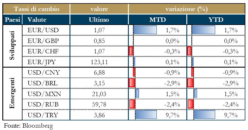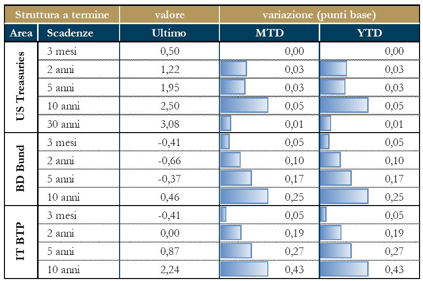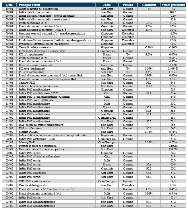La pubblicazione dei valori preliminari degli indici PMI dell’Area Euro per il mese di gennaio confermano il quadro positivo per l’economia dell’area: l’indice composito ha confermato i livelli elevati di fine 2016, attestandosi a 54.3 marginalmente al di sotto del precedente 54.4. A livello settoriale continua il recupero del manifatturiero (l’indice PMI manifatturiero sale a 55.1 dal precedente 54.8), mentre sono poco mossi i sondaggi per i servizi (l’indice PMI servizi scende a 53.6 dal precedente 53.7). La scomposizione per paese riserva qualche sorpresa: in Germania di osserva un rallentamento del settore dei servizi – l’indice PMI servizi registra una decisa correzione da 54,3 a 53,2 punti – e un’accelerazione dello stesso sondaggio per le imprese manifatturiere. Allo stesso tempo, l’indice IFO di gennaio sul clima di fiducia delle industrie tedesche ha riportato un leggero rallentamento a 109.8 da 111, guidato dalla componente delle aspettative. In riferimento all’Italia, se gli ordini industriali di novembre fanno registrare un +1.5% su mese e +0.1% su anno, le vendite al dettaglio dello stesso mese sono invece in calo dello 0.7% congiunturale; se anno, tuttavia, il dato è in crescita dello 0.8%. Indicazioni positive anche dalla prima lettura del PIL del Regno Unito, che è aumentato 0.5% t/t, portando la crescita annuale a 2.2%. La crescita è stata guidata dai servizi con un forte contributo della spesa per consumi.