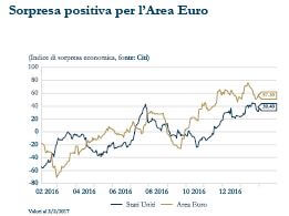 Come già anticipato dagli indici di sorpresa economica nelle prime settimane del 2017, la pubblicazione delle stime preliminari dei valori di crescita per il 4°T 2016 conferma l’accelerazione dell’Area Euro a fronte di una moderata decelerazione degli Stati Uniti. La differente velocità di crociera potrebbe dipendere dalla diversa fase del ciclo economico delle due aree geografiche: l’economia statunitense è in una fase avanzata del ciclo economico, il mercato del lavoro è prossimo al pieno impiego e l’inflazione si avvia al target della Fed, che ha iniziato la propria farse di rialzo dei tassi. Nell’Area Euro la crescita è in graduale consolidamento, le misure di politica monetaria hanno ridotto i rischi di deflazione e posto le premesse per un progressivo ritorno alla stabilità monetaria. Ma non vi è ancora un segnale di un chiaro punto di svolta nella dinamica dell’inflazione. Secondo le stime preliminari, la crescita dell’Area Euro ha segnato una modesta accelerazione nell’ultimo trimestre del 2016: il PIL è cresciuto dello 0.5% rispetto al trimestre precedente e di un 1.8% rispetto allo stesso periodo dello scorso anno, beneficiando al contempo di una revisione al rialzo del tasso di espansione nei mesi estivi. La recente pubblicazione del dato preliminare degli indici PMI per il mese di gennaio segnala che questa accelerazione dovrebbe continuare nei prossimi mesi. Viceversa, il 2016 si è chiuso in frenata per l’economia statunitense. La stima preliminare del PIL degli Stati Uniti nel quarto trimestre del 2016 ha mostrato un modesto rallentamento (1.9% t/t annualizzato) rispetto al valore del terzo trimestre dell’anno (3.5% t/t annualizzato), penalizzata dal deficit commerciale. Il dettaglio delle sue componenti ha mostrato un sentiero di crescita piuttosto bilanciato e sostenuto da una sostanziale tenuta dei consumi e degli investimenti. Il dato più importante è, forse, proprio da leggersi nel dato degli investimenti aziendali, cresciuti per il terzo trimestre consecutivo e spinti dall’aumento dei prezzi dell’energia e dalle promesse di una futura riforma delle imposte societarie. Questo a fronte di una spesa per consumi che si avvantaggia di un mercato del lavoro prossimo al pieno impego e dal conseguente aumento dei salari. Il dato medio dell’intero anno colloca la crescita a 1.6%, un punto in meno rispetto all’anno precedente e che è il più debole degli ultimi cinque anni: la politica monetaria ultra espansiva della Fed è riuscita a “diluire” la crescita in un più lungo lasso di tempo, infatti il ciclo attuale è ai massimi storici per longevità, ma ai minimi per robustezza ed intensità. I dati dei sondaggi relativi al mese di gennaio incoraggiano a prevedere un rimbalzo della crescita nel primo trimestre 2017, in attesa che si chiarisca se la politica economica di Trump segnerà il passaggio di testimone dalla politica monetaria a quella fiscale.