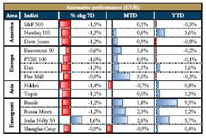 In Cina l’indice Caixin manifatturiero si è attestato in rallentamento e al di sotto delle attese. Adattandosi con la narrazione di una decelerazione economica in atto negli ultimi mesi, l’indice si ferma a 51 punti dai 51.9 del mese precedente. A margine, il report Caixin ha evidenziato un rapido aumento dei prezzi e una riduzione delle scorte. La PBoC si è comunque mostrata confidente sullo stato dell’economia cinese ed, a sorpresa, ha alzato i tassi a breve termine, offrendo un nuovo segnale di stretta monetaria. Il tasso sul repo a 7 giorni è stato alzato di 10 punti base al 2.35%. La BoJ ha mantenuto invariato sia il target sui tassi di interesse sia il programma di acquisto di titoli, mantenendo la propria stance ultra-espansiva e confermando che il suo obiettivo resta far uscire l’economia dalla deflazione e raggiungere la stabilità dei prezzi il prima possibile, chiarendo che le operazioni giornaliere di acquisti di titoli di stato sono puramente uno strumento per raggiungere il livello desiderato della struttura a termine dei rendimenti. Quindi, i tempi, le quantità e la frequenza delle operazioni di acquisto non vanno letti come indicazioni della futura direzione della politica monetaria ma saranno decisi sulla base delle condizioni di mercato e di altre considerazioni pratiche, come il recente eccessivo apprezzamento dello yen.