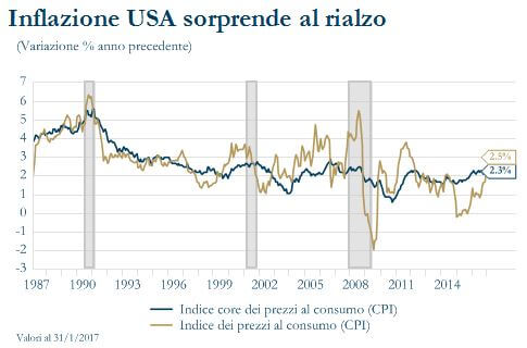 Le indicazioni provenienti questa settimana dai dati macroeconomici sono particolarmente incoraggianti. La variazione dell’indice CPI per il mese di gennaio ha sopreso al rialzo (2.5% a/a), attestandosi ben al di sopra delle attese. L’inflazione core, al netto della componente piu’ volatile di energia ed alimentare, si è attestata a 2.3% a/a. Gli indici dei prezzi rilasciati questa settimana, pur non rappresentando le misure prese a riferimento dalla Fed, confermano l’esistenza di significative pressioni al rialzo per l’inflazione. Anche le vendite al dettaglio sono creciute piu’ delle attese (+0.4% m/m) nel mese di gennaio, confermando anche nel 2017 che dai consumi continuerà a venire un’importate contributo della crescita economica degli Stati Uniti. L’indice NAHB dei costruttori di abitazioni, pur in lieve rallentamento, resta vicino ai massimi storici (65). L’indice aveva raggiunto a dicembre il massimo post-crisi (69). Per ora il comparto sembra non risentire del rialzo del costo del denaro di dicembre. L’indice Empire State della Fed di New York che rileva la fiducia per le imprese manifatturiere è aumentato a 18,7 da 6,5 nel mese di febbraio. Anche la scomposizione della survey è stata particolarmente positiva. Vi è stato un significativo miglioramento dei nuovi ordini (a 13,5% da 3,1%) e dell’indice di occupazione (a 2,0% da -1,7%). L’indice dei prezzi pagati è aumentato, raggiungendo il massimo degli ultimi tre anni (37.8), probabilmente riflettendo i recenti guadagni dei prezzi delle materie prime. Inoltre l’indice manifatturiero Philly Fed ha raggiunto un massimo da 33 anni a 43.3 nel mese da 23,6: questo è un’altra indicazione il settore manifatturiero si è lasciato alle spalle la debolezza nel 2016. L’indice Philly Fed è ora ad un livello che, sulla base del rapporto storico, sembrerebbe puntare a una crescita del PIL di poco superiore al 6%.