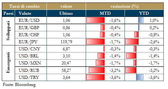 I dati di maggior rilievo rilasciati questa settimana all’interno dell’Area Euro sono quelli relativi alla seconda stima del PIL del 4° trimestre ed ai verbali della riunione BCE di gennaio. Con la seconda stima del PIL la crescita del 2016 è stata leggermente rivista al ribasso rispetto alla precedente stima (+0.4% vs +0.5% su trimestre e +1.7% vs +1.8% su anno). La revisione al ribasso è da imputarsi principalmente alla revisione della crescita in Germania. In questa direzione, tra i dati nazionali, l’indice tedesco ZEW, che misura la fiducia delle imprese tedesche. L’indice è diminuito nel mese di febbraio in entrambe le sue componenti, aspettative (10.6 dal precente 16.6) e situazione corrente (76.4 rispetto al precedente 77.3), è indica ad un rallentamento della crescita del PIL. Piu’ rilevanti i verbali della riunione della BCE che confermano il tono accomodante della politica monetaria e aprono la porta a possibili deviazioni temporanee dal capital key negli acquisti dei titoli di Stato di tutti i paesi rientranti nel QE (finora limitate solo a quelli irlandesi e portoghesi per ragioni di scarsità). Nei verbali si legge che la BCE è disposta a modificare temporaneamente il meccanismo di acquisti ed, in particolare, il meccanismo del capital key, mentre una chiusura o una riduzione anticipata del programma è da escludersi, dal momento che la dinamica dell’inflazione non consegna ancora segnali convincenti di trend al rialzo.