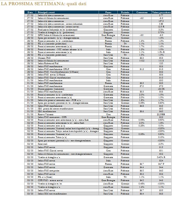 Europa: Focus sul settore industriale, nello specifico su quello dei beni strumentali, con Leonardo che ha comunicato due ordini: uno per l’acqusito da parte del ministero della difesa del Pakistan di elicotteri bimotore e l’altro per radar a scansione elettronica da Safran Electronics&Defense. Inoltre, secondo il Corriere della Sera, la lista dei nomi in vista delle assemblea di aprile per il rinnovo dei vertici sarebbe questa: Caio, Scaramella e Giulianini. La società, in aggiunta, ha registrato oltre €500mln di risultato netto nel 2016 mentre i risultati e il piano industriale in versione definitiva verranno resi noti il 16 marzo. Fincantieri ha annunciato un accordo di collaborazione con Ferretti Group; l’obiettivo è quello di sviluppare sinergie industriali e commerciali tra il gruppo navalmeccanico e una delle società più riconosciute a livello mondiale della nautica da diporto. Fincantieri, inoltre, firmerà nuovi ordini, il cui valore non è stato comunicato, per la costruzione di navi da crociera dedicate al mercato locale cinese. In aggiunta, la società si è aggiudicato un ordine dalla Royal Australian Navy per €25mld. Buone notizie per Prysmian, che si è aggiudicata un contratto di oltre €300mln con la Réseau de Transport d’Électricité in Francia, con l’obiettivo di trasmettere a migliaia di aziende e abitazioni energia rinnovabile prodotta da impianti eolici off-shore. Astaldi ha concluso un accordo per l’ingresso di Meridiam Latam Holding nel capitale di SCMS; Meridiam entrerà con una quota pari al 49% e un investimento complessivo pari a €305mln. In ambito estero, Airbus chiude il 2016 con gli utili in calo di oltre il 60% nel 2016 a €995mln, mentre il fatturato è salito del 3% a €67mld; sui conti pesano gli oneri sul velivolo A400m pari a €2.2mld rispetto a €1.1mld del primo semestre dell’anno. Il gruppo, inoltre, ha proposto un dividendo di €1.35 per il 2016, contro gli €1.30 per azione distribuiti nel 2015. Nel settore bancario e assicurativo, Generali ha acquistato 510mln di azioni ordinarie Intesa Sanpaolo, pari al 3.04% del capitale della banca, per un investimento di circa €1.1mld e ha avviato la procedura per chiudere il prestito titoli precedentemente annunciato. Frederic de Courtois, inoltre, ha sottolineato che le attività estere del gruppo “sono un fattore chiave”. Riguardo MPS, la banca ha avviato la vendita sul mercato dei due bond garantiti dallo Stato, a uno e tre anni, emessi e sottoscritti dallo stesso istituto a fine gennaio per complessivi €7mld, secondo quanto riferito da fonti. Nella seduta di borsa di martedì, le azioni Mediolanum hanno perso il 6.73%, dopo che la società ha comunicato di aver archiviato il 2016 con un utile netto in contrazione del 10%, a €393.5mln, ma commissioni di gestione in crescita, a €849mln dagli €815mln dell’anno precedente, “grazie alla forte raccolta netta nei fondi comuni”. Secondo IlSole24Ore, Carige sta valutando due opzioni per la pulizia dei crediti deteriorati: una maxi-cartolarizzazione da €2mld lordi ma anche il deconsolidamento di €3-3.5mld tramite la scissione di un veicolo ad hoc. Il CdA di Banca Imi ha approvato il bilancio al 31 dicembre 2016 mentre l’approvazione dell’Assemblea si terrà il 13 aprile; la proposta di destinazione dell’utile di esercizio prevede la distribuzione di un dividendo di €654.5mln alla controllante Intesa Sanpaolo. Tra gli altri settori: Mondadori ha dichiarato, su richiesta Consob, che il 9 febbraio il Cda ha approvato il piano economico-finanziario 2017-2019 che vede a fine periodo ricavi per oltre €1.3mld, un Ebitda adjusted di €115mln e un utile netto di €35mln. I risultati preliminari del 2016 di Terna hanno evidenziato un Ebitda di €1.54mld e ricavi a €2.1mld, entrambi in linea con il 2015. La società ha presentato, inoltre, il piano strategico 2017-2021, che prevede investimenti in crescita del 30% a €4mld, ricavi in aumento a €2.3mld e Ebitda a €1.7mld. Tenaris ha terminato il 2016 con ricavi per $4.29mld, in contrazione del 38% rispetto ai $6.9mld realizzati nell’esercizio precedente e inferiore ai $4.56mld stimati dagli analisti. Al contrario il risultato finale è passato da una perdita di $80.16mln a un utile di $55.3mln, meglio dei $50mln del consenus. Il primo azionista di Vivendi, Bollorè, è indagato dalla Procura di Milano per l’ipotesi di reato di aggiotaggio nell’operazione con la quale Vivendi ha comprato azioni Mediaset salendo nel dicembre scorso sino al 28.8%. Saipem, infine, ha riportato un risultato netto 2016 in rosso per €2.087mld al netto di svalutazioni e oneri da riorganizzazione per €2.313mld; i ricavi del 2016 sono stati di €9.976mld dai €11.507mld del 2015.