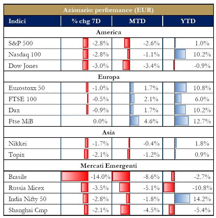 NORD AMERICA Tecnologici: Spotify sarà il primo grande gruppo a portare a termine, tra quest’anno e l’anno prossimo, un processo di direct listing sulla borsa di New York. Yahoo ha dichiarato di volere riacquistare fino a $3mld di azioni così da fornire liquidità agli azionisti che desiderano vendere le proprie partecipazioni prima del deal con Verizon. Google ha comunicato di voler rendere disponibile il proprio assistente digitale su iPhone, sfidando così le caratteristiche di Siri. Tale mossa si spiega all’interno della battaglia tra Google, Apple e Amazon per la sostituzione di tastiere e touch screen. Qualcomm, nel mezzo della battaglia legale con Apple, ha presentato una causa contro Foxconn Technology, Pegatron, Wistron e Compal Electronics per i mancati pagamenti di royalties; sarebbe stata Apple a spingere le quattro società a non pagare le royalties persuadendole che le avrebbe indennizzate nel caso di danni risultanti da violazioni dei loro contratti con Qualcomm. Cisco Systems ha registrato per il sesto mese consecutivo un calo nei ricavi trimestrali, in gran parte dovuto alla crisi della divisione router. Nel Q3 l’utile netto della società è salito a $2.52mld dai $2.35mld di un anno prima, viceversa, i ricavi sono scesi dello 0.5% a $11.94mld. I prezzi delle azioni Snap sono fortemente saliti segnando il terzo giorno record da dopo l’IPO del gruppo, rafforzata dalla notizia che diversi investitori istituzionali possedevano i titoli. Salesforce.com ha comunicato un aumento del 24.6% nei ricavi trimestrali, grazie a una forte domanda per i prodotti cloud-based e per i software di marketing; nonostante ciò il gruppo ha registrato una perdita netta di $9.2mln nel Q1 contro un profitto di $38.8mln di un anno prima. Alibaba ha annunciato un buyback di $6mld per i prossimi due anni, l’annuncio arriva dopo che il gruppo ha superato le previsioni per i ricavi del Q1, ma non quelle relative ai profitti; i profitti per azione sono infatti stati di ¥4.35 contro stime per ¥4.48. Infine, Western Digital ha tentato il ricorso a un arbitrato internazionale nel tentativo di fermare Toshiba, società partner, che sta cercando di vendere la divisione chip senza il consenso di Western Digital; la divisione chip rappresenta un’importante iniezione di capitale per il gruppo giapponese. Farmaceutico: test clinici del farmaco Durvalumab hanno mostrato che riduce la progressione della malattia nei pazienti affetti da cancro ai polmoni; tale risultato ha fortemente incrementato il prezzo delle azioni di AstraZeneca.Food: AB InBev sta pianificando un investimento da $2mld negli Stati Uniti; qui infatti durante gli ultimi tre anni il gruppo ha visto una riduzione importante dei volumi d’acquisto per il proprio prodotto Budweiser. Wal-Mart ha riportato vendite trimestrali sopra le attese nei negozi degli Stati Uniti, grazie agli investimenti fatti per incrementare il numero di clienti e all’e-commerce; la clientela è aumentata dell’1.5%, in salita per il decimo trimestre consecutivo, mentre le vendite online hanno incrementato i guadagni del Q1 di 0.8 punti percentuali.Industriali: durante il debutto sul mercato i prezzi delle azioni di Gardner Denver Holdings sono aumentati conferendo al produttore di macchinari industriali un valore di circa $4mld. L’IPO riguardava 41.3mld di azioni prezzate a $20 l’una, un po’ sotto le attese di $23/26 per azione. Abbigliamento: le catene di negozi J.C. Penney hanno registrato nuovi ricavi deludenti; nel Q1 le vendite nette sono diminuite del 3.7% a $2.71mld, scendendo per il terzo mese consecutivo e attestandosi sotto le stime degli analisti. TJX Cos ha riportato la crescita più lenta delle vendite nei propri negozi in dieci trimestri e prevede profitti deludenti per quello in corso: le previsioni per il Q2 sono di 81/83 centesimi per azione contro attese degli analisti di 92 centesimi per azione. American Eagle ha abbassato la guidance per i profitti del Q2 poiché la forte competizione nel settore ha costretto la società a fare sconti e ad affrontare costi maggiori per gli ordini online. Le previsioni per il Q2 sono di profitti nel range di $15/17 centesimi per azione contro stime di $23 centesimi. Infine, Ralph Lauren ha fatto sapere che le vendite trimestrali sono scese del 16.3%; é il nono trimestre consecutivo di calo e la causa principale è la forte riduzione della clientela. Settore auto: Ford Motor ha dichiarato di avere pianificato il taglio di 1,400 posti di lavoro nel Nord America e in Asia attraverso pensionamenti anticipati volontari e ulteriori incentivi fiscali nel tentativo di aumentare i prezzi delle azioni. General Motors ha deciso di interrompere le vendite di automobili in India dalla fine di quest’anno dopo due decenni di presenza in uno dei mercati più competitivi al mondo; in India GM rappresenta meno dell’1% di quota di mercato. Retail: Target ha riportato vendite e profitti trimestrali sopra le attese e si dice ottimista per i risultati full year. La società si sta focalizzando sull’apertura di piccoli outlet e sta investendo molto nell’e-commerce; le vendite online sono aumentate del 22% nel primo trimestre. Home Depot ha annunciato vendite per l’ultimo trimestre fiscale in aumento del 5% annuo a $23.89mld e un utile netto in aumento del 12% a $2.01mld, superando le stime degli analisti, grazie all’incremento delle spese per gli articoli domestici più costosi; il gruppo ha alzato la guidance. (*) Dati forniti da Mediobanca – Banca di Credito Finanziario S.p.A.