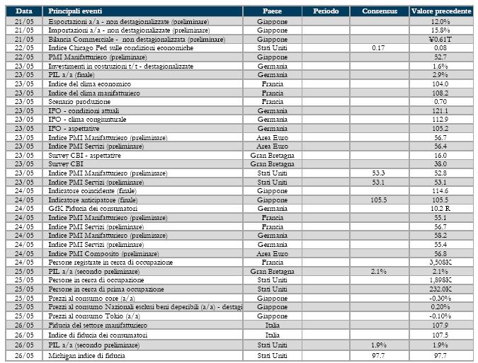 - Stati Uniti: Proseguiranno le indicazioni sul mercato immobiliare, con vendite di case esistenti e di nuove case e verranno pubblicati la seconda lettura del PIL del primo trimestre. L’attenzione sarà sui verbali dell riunione del FOMC di inizio maggio.