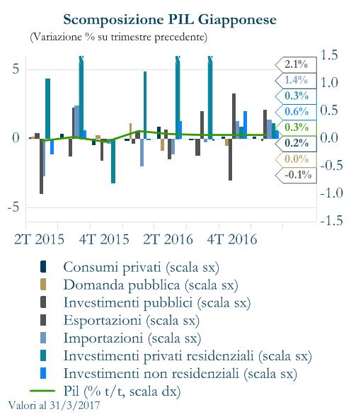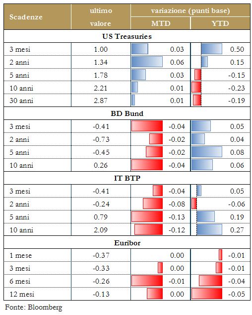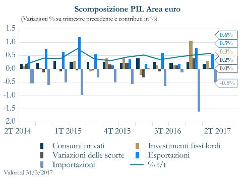Nel meeting di giugno la BCE ha lasciato invariati il corridoio dei tassi di interesse di riferimento (il tasso centrale (refi) resta allo 0,0%, il tasso di rifinanziamento marginale stabile a +0,25% e quello sui depositi a -0,4%) e le modalità del piano di acquisti (acquisti ad un ritmo mensile di 60 miliardi di euro sino alla fine di dicembre 2017), ma ha eliminato l’easing bias sui tassi di interesse, rimuovendo la formula che specifica che i tassi potranno scendere “su livelli più bassi rispetto a quelli attuali”.