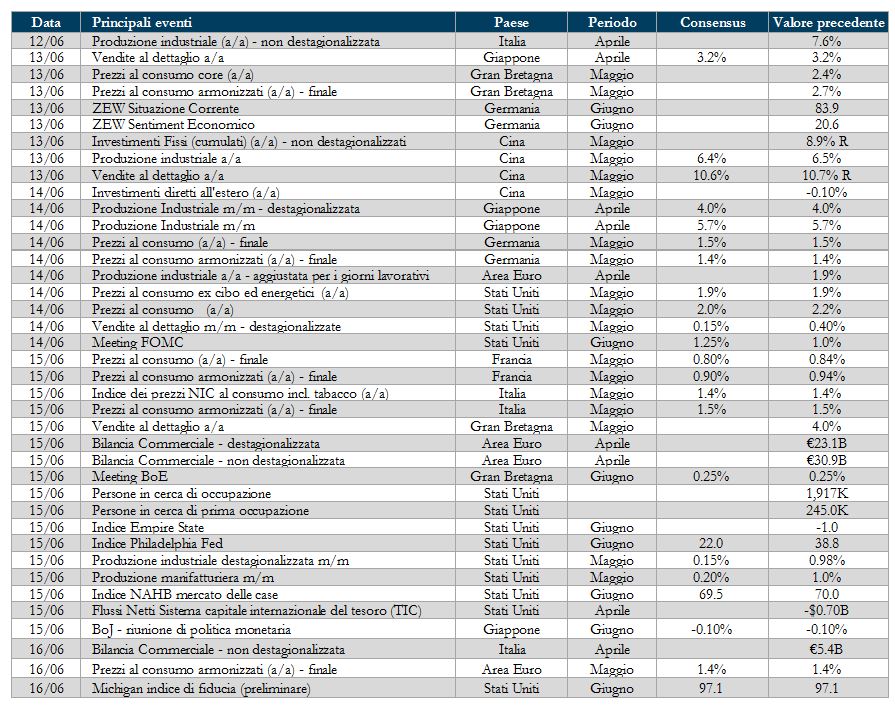 - Stati Uniti: attenzione rivolata alla riunione del FOMC. La Fed avrà a disposizione anche il dato dell’inflazione di maggio che verrà pubblicato in settimana