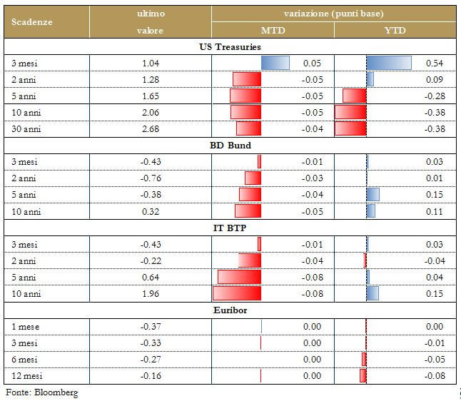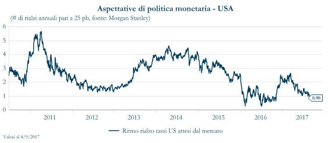 Indicazioni che questa (temporanea) debolezza durerà anche nei prossimi mesi, provengono anche dall’indice dei prezzi alla produzione, che in luglio è calato dello 0,1% sia nella componente headline sia nella componente core. Nel breve periodo, l’inflazione CPI core risentirà di effetti transitori negativi e ci aspettiamo che resti attorno ai livelli attuali fino alla fine dell’anno. Nel medio periodo, invece, lo scenario per l’inflazione statunitense resta positivo, supportato da molteplici fattori: la forza del mercato del lavoro, l’effetto ritardato del momentum macroeconomico, nonché la debolezza del dollaro. Una marcata sorpresa negativa, potrebbe far diminuire ulteriormente la probabilità di un rialzo dei tassi prezzata dal mercato, pesando cosi sulla struttura a termine governativa statunitense.