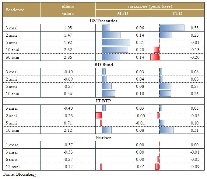 Mercoledì a Indianapolis, il Presidente Trump ha presentato il progetto quadro della sua riforma fiscale, elaborato dopo mesi di trattative con i Repubblicani del Congresso La proposta di riforma dovrà essere discussa e poi votata dal Congresso, processo che richiederà ancora dei mesi, ma che dovrebbe concludersi entro i primi mesi del 2018, e permettere così di aprire la campagna elettorale repubblicana con un risultato positivo. Conseguentemente, i mercati sono tornati a prezzare il Trump reflation trade, e quindi a scommettere che la politica fiscale sarà in grado di prolungare la ormai longeva espansione statunitense: le break-even inflation sono tornate a crescere, i rendimenti a dieci anni dei titoli governativi statunitensi hanno toccato il massimo dal mese di agosto, mentre il dollaro si è apprezzato.