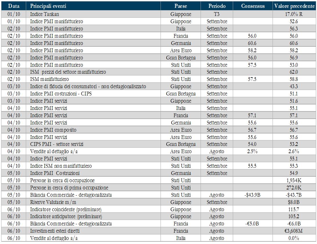 - Stati Uniti: focus sul repor del mercato del lavoro, con pay-rolls e tasso di disoccupazione di settembre. Saranno inoltre disponibili gli ordini di fabbrica e di beni durevoli e i valori finali degli indici PMI di settembre.