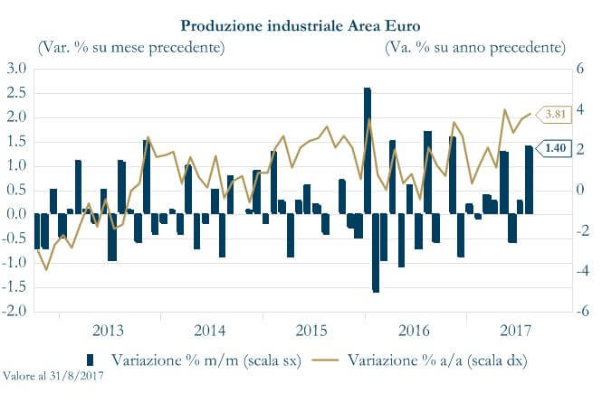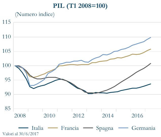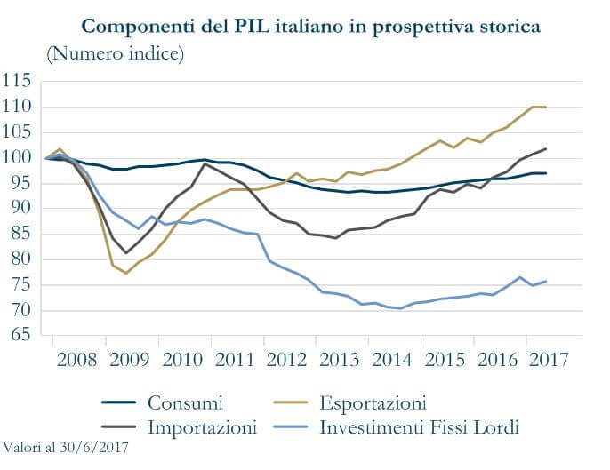 La ripresa dell’economia italiana procede con passo regolare in un quadro di più rapida crescita europea. In T2 il PIL è aumentato dello 0.4% t/t, oltre le attese, comportando un’accelerazione dell’incremento tendenziale dall’1.2% a/a all’1.5% a/a, mentre l’Area Euro nel suo complesso è cresciuta dello 0,6 t/t (pari a 2,3% a/a). Tuttavia il valore del prodotto interno lordo resta ancora inferiore al livello del 2008, mentre il PIL dell’Area Euro è tornato già in T2 2015 ai livelli pre-crisi. Particolarmente penalizzati sono gli investimenti fissi lordi, che in prospettiva storica si mantengono ad un livello nettamente inferiore al livello pre-crisi. Nella prima parte del 2017, invece, la crescita dell’economia è stata guidata dagli investimenti e dalle esportazioni in un contesto di continuo e graduale miglioramento del mercato del lavoro. Gli investimenti si sono avvantaggiati di condizioni finanziarie favorevoli e della riduzione dei margini di risorse inutilizzate, ma hanno anche messo a frutto le agevolazioni fiscali provenienti dal piano “Industria 4.0”. La componente relativa ai mezzi di trasporto si è confermata come la componente più dinamica e presenta in questa fase una crescita superiore a quella degli altri maggiori paesi dell’Area. Sugli investimenti in costruzioni, invece, incidono in negativo i vari disincentivi fiscali e di tassazione, oltre al numero elevato di immobili invenduti o vuoti. Per questo, in T2 la ripresa degli investimenti in costruzioni, più graduale, ha invece subito una battuta d’arresto, con una diminuzione che ha interessato, pressoché in egual misura, sia il comparto residenziale (-0.5%) sia quello non residenziale (-0.4%). La crescita dei consumi, che ha mostrato una relativa tenuta nella prima parte del 2017, dopo il rallentamento registrato in T3 e T4 del 2016, in T2 ha leggermente moderato il passo. Nel caso dell’Italia, la forte accelerazione di domanda di lavoro, avvenuta alla fine del 2015 e nel 2016, è stata favorita dalla decontribuzione per i nuovi assunti a tempo indeterminato. Tuttavia, il fisiologico raffreddamento che ne è seguito è risultato inferiore alle attese, a testimonianza di come il rafforzamento della ripresa della domanda, interna ed estera, stia sostenendo l’occupazione al di là degli incentivi. In termini storici, la ripresa attuale si configura come la più lenta ma longeva mai sperimentata in Italia: in dieci trimestri il PIL è cresciuto di 2.9%, poco meno dello 0.3% per trimestre, ma allo stesso tempo le riprese del passato si sono concluse prima del decimo trimestre, mentre la ripresa di oggi è ancora in corso e continuerà nella seconda parte del 2017 e nel corso del 2018 come lasciano prevedere gli indicatori anticipatori. Infatti la fiducia delle imprese ha continuato a migliorare e contemporaneamente si è assistito ad un rimbalzo della fiducia dei consumatori. Per questo, ci aspettiamo un consolidamento della ripresa economica, aiutata da un ambiente esterno favorevole e sostenuta dagli investimenti, che dovrebbero avere più spazio in questa fase congiunturale. Questa tesi è supportata anche dalle ultime previsioni del FMI, che all’interno dell’ultimo rapporto semestrale World Economic Outlook ha rivisto al rialzo la stima sulla crescita italiana, portandola a 1.5% da 1.3% di luglio sul 2017 e 1.1% da 1% sul 2018.