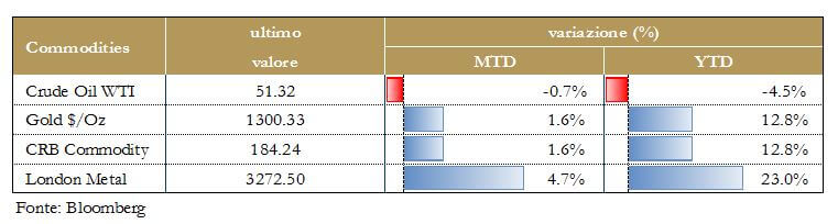 Il surplus commerciale cinese ha toccato il minimo da sei mesi (28.5 miliardi di dollari) a settembre, al di sotto della attese (38.0 miliardi di dollari). La principale sorpresa è arrivata dalle importazioni, aumentate del 18.7% a/a (il tasso di crescita più elevato da marzo) rispetto al 13,5% atteso, mentre le esportazioni sono aumentate dell’8.1% contro l’8.8% atteso. Le importazioni sono state guidate da una forte accelerazione proveniente da UE e nel Giappone, mentre quelle provenienti dagli Stati Uniti hanno rallentato. Il dato si inserisce nel processo di rimodulazione della produzione cinese verso settori meno inquinanti. A fronte di una crescita media nel settore manifatturiero sostanzialmente in linea con quanto sperimentato nel 2016, la produzione si sta riducendo in alcuni settori molto inquinanti, come quello estrattivo e della lavorazione delle materie prime. Ciò ha portato a un incremento delle importazioni di commodity in sostituzione della ridotta produzione domestica, complice anche il rafforzamento dello yuan. In Giappone, il Leading Index, che sintetizza le previsioni di andamento dell’economia nei mesi a venire è salito ad agosto, portandosi a 1.6 dai -0.7 punti di luglio. Sale anche l’analogo indice sui coincident indicator, a 1.9 da -1.2 punti, confermando così la valutazione di un’economia in miglioramento. Scendono gli indici PMI: il PMI composito relativo a settembre risulta pari a 51.4 punti dai precedenti 52.7, il PMI servizi scende invece a 50.6 rispetto ai precedenti 52.7.