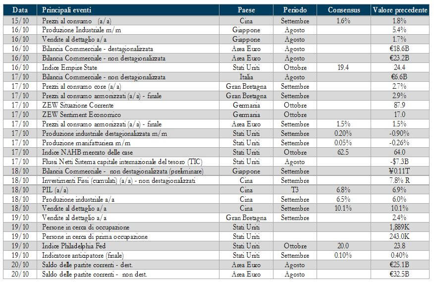- Asia: in Cina verranno pubblicate l’inflazione di settembre, la produzione industriale e PIL del terzo trimestre. In Giappone sarà pubblicata la produzioine industriale e la bilancia commerciale.