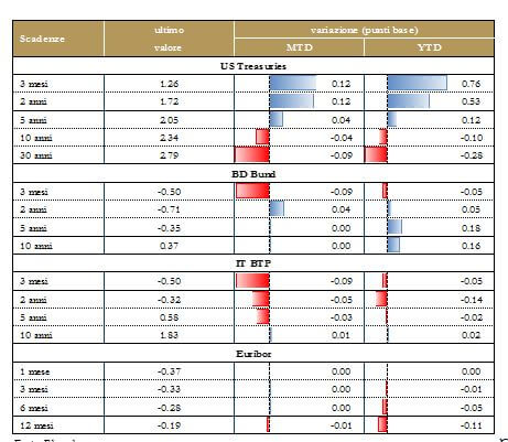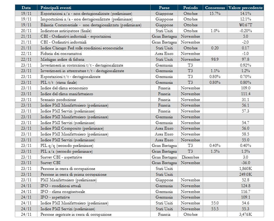 - Europa: indici PMI e IFO per il mese di novembre, che dovrebbero confermare la solida fase di espansione e i verbali dell’ultima riunione della BCE, che offriranno indicazioni sulla divergenza di opinioni all’interno del Consiglio.