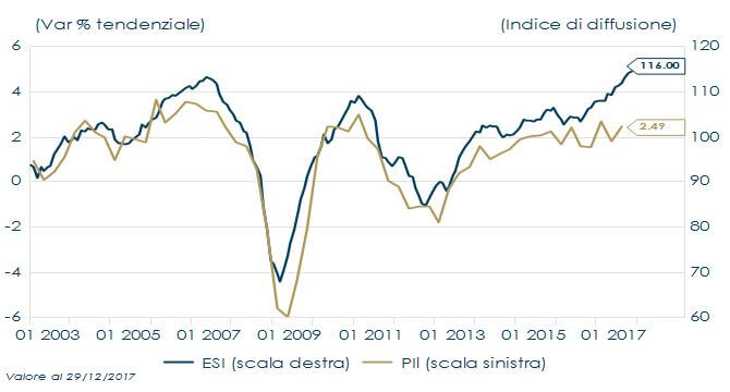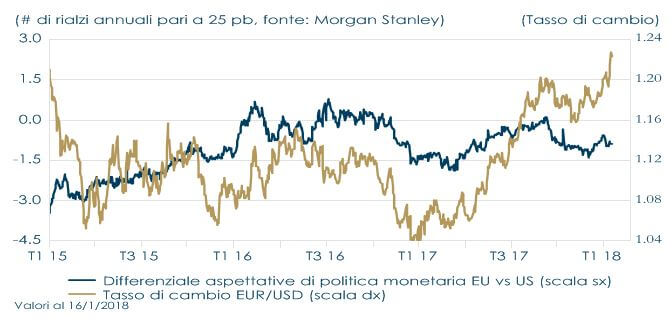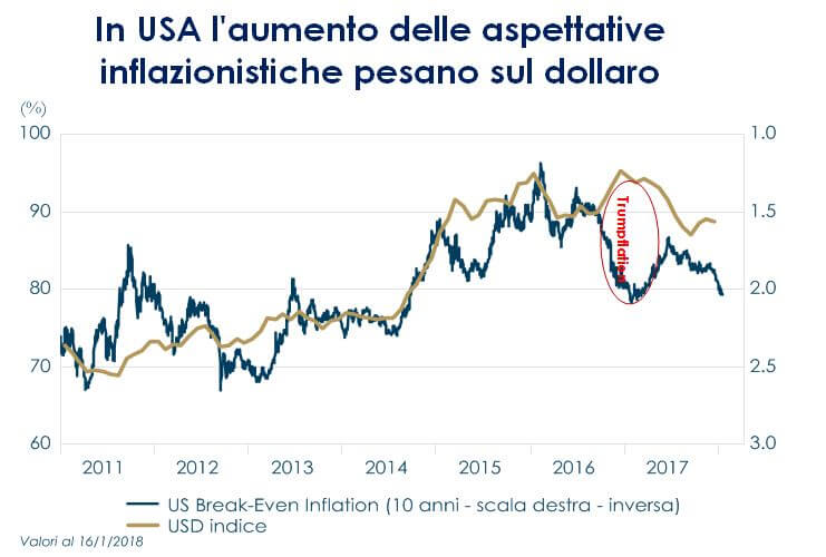 Il tasso di cambio EUR/USD è tornato ad apprezzarsi nelle prime settimane dell’anno, toccando nuovi massimi da dicembre 2014 (1.23 nelle contrattazioni in Asia), tanto che gli esponenti della BCE hanno espresso crescenti timori sull’apprezzamento della moneta comune. In settimana il Vicepresidente della BCE Constancio, ribadendo che l’istituto centrale non ha come obiettivo il controllo del tasso di cambio, si è dichiarato preoccupato per “i movimenti della valuta che non riflettono i fondamentali”, i quali (come l’inflazione leggermente diminuita in dicembre e che continua a non soddisfare le aspettative) non giustificano un cambiamento imminente della politica monetaria. La BCE cerca così di calmierare il movimento innescato la settimana scorsa dalla pubblicazione dei verbali della sua riunione di dicembre, che hanno generato aspettative di una possibile riduzione degli acquisti e/o di una modifica della forward giuidance, sulla scia dei continui miglioramenti dei dati congiunturali. Nell’Area Euro gli indicatori anticipatori hanno evidenziato una notevole vivacità, che sembra indicare il prolungamento di una crescita solida. L’indice di fiducia ESI (Economic Sentiment Indicator) segnala il protrarsi ininterrotto della crescita del PIL in termini reali, tendenza che interesserà la maggior parte dei paesi e che prelude a un andamento robusto nel 2018 (figura 1). Ad amplificare il movimento ha inoltre contribuito la debolezza del dollaro, su cui ha impattato l’aumento delle aspettative inflazionistiche degli Stati Uniti. La figura 2 mostra che generalmente il dollaro si muove inversamente alle break-even inflation, a meno di alcune eccezioni (ad esempio durante la fase di “Trumpflation”), attraverso il meccanismo della Purchasing Power Parity e dei rendimenti reali.