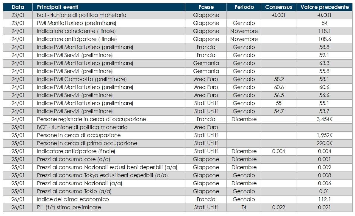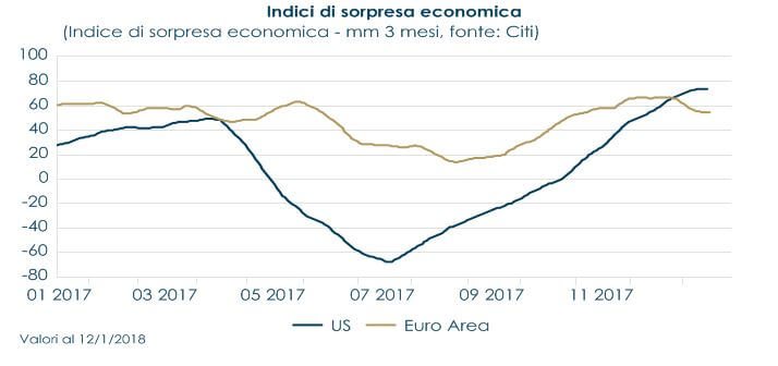 Settimana positive per I listini azionari globali. Da inizio anno il guadagno della borsa americana rimane positivo. La maggiore incognita per gli investitori in questa fase è capire quali saranno gli effetti della riforma fiscale sugli utili societari. Si profila però anche l’ipotesi di blocco delle attività dell’amministrazione pubblica, in quanto il Presidente ha alzato il tono del confronto con i democratici sull’estensione del Children Health Insurance, che fornisce copertura a un gran numero di minori. I mercati azionari europei hanno riportato una perfomance positiva. Milano si conferma la piazza migliore e l’Italia resta al centro dell’attenzione degli investitori e delle agenzie di rating per i temi legati alle sofferenze delle banche e alle prossime elezioni politiche.In Asia i listini cinesi hanno beneficiato della pubblicazione del valore del PIL in T4 e delle nuove iniezioni di liquidità apportate dalla PoBC. L’attenzione dei mercati ora si focalizza sulla crescita di quest’anno per vedere se gli effetti cumulativi di regolamenti e riforme hanno un impatto restrittivo.