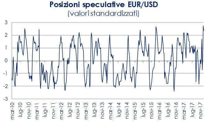 Le indicazioni provenienti dagli indicatori di flusso indicano ora un posizionamento (lungo) estremo a favore dell’euro. Secondo i dati pubblicati sulla borsa di Chicago (figura 5), le posizioni lunghe nette in EUR sono aumentate di altri $ 8 miliardi nei primi due rapporti del 2018 e sono pari a $ 21,6 miliardi in totale, il livello più alto mai registrato. Contestualmente, Nomura riporta che nella settimana terminata il 9 gennaio, il posizionamento netto dei fondi a leva in EUR è aumentato dal 16% al 26% (massimo annuale) e che i gestori patrimoniali sono lunghi di EUR in linea con la media semestrale. Queste considerazione evidenziano nuovamente che le variabili chiave saranno l’inflazione negli Stati Uniti e le attese di cambiamento di politica monetaria da parte della BCE nell’Area Euro.