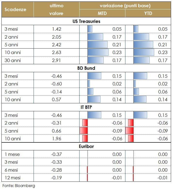 Sulla scia di dati congiunturali forti, i rendimenti dei titoli obbligazionari hanno continuato ad aumentare, con il decennale statunitense che ha toccato 2.6% per la prima volta da marzo 2017. L’attenzione dei mercati è rivolta al processo di normalizzazione in atto della politica monetaria. Questa settimana, sulla scia di fondamentali economici robusti la Bank of Canada ha aumentato il tasso di riferimento a 1,25%. La settimana prossima sarà la volta delle riunioni di politica monetaria della BoJ e della BCE. L’obiettivo della BCE sarà quello di orientare le aspettative di mercato sul futuro percorso dei tassi di interesse e del term premium, cercando di evitare un aumento della volatilità e un inatteso e disordinato inasprimento delle condizioni finanziarie. Per questo riteniamo che la BCE manterrà inalterata la comunicazione, per limitare un’ulteriore correzione del cambio e dei rendimenti obbligazionari. Sarà, infatti, importate vedere le considerazioni della BCE sul rafforzamento della valuta comune. Relativamente al Giappone, Reuters ha riferito che la BoJ durante la riunione di politica monetaria della settimana prossima (22-23 gennaio) continuerà ad impegnarsi a guidare i tassi di interesse a breve a 0,1% e i rendimenti dei titoli a 10 anni intorno allo 0%. Probabilmente, questa manterrà intatto l’impegno a comprare titoli di stato, e conseguentemente le sue posizioni aumenteranno all’incirca a un ritmo annuale di ¥ 80 trilioni ($ 724 miliardi).