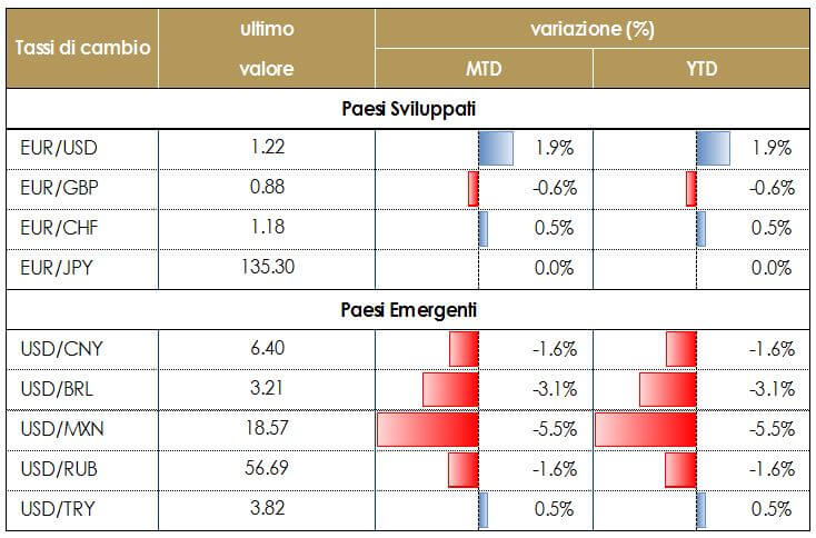 Riteniamo che l’evoluzione della politica fiscale negli Stati Uniti e la rimodulazione delle attese future da parte della Fed guideranno il tasso euro-dollaro fino alla fine dell’anno.