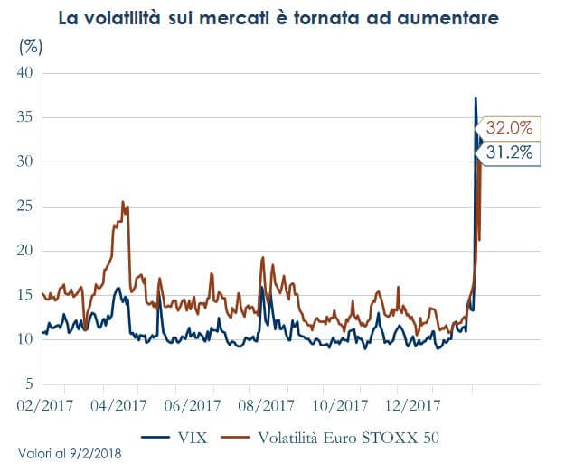 La marcata correzione del mercato azionario di questa settimana è stata innescata dal timore che una fiammata inflazionistica possa portare ad un cambiamento della funzione di reazione delle banche centrali, aumentando il ritmo di inasprimento della politica monetaria, con un contestuale aumento del premio per il rischio di inflazione, del term pemium (quindi dei rendimenti dei titoli governativi) e un conseguente restringimento delle condizioni finanziarie. Il movimento ha portato con sé un aumento della volatilità implicita a breve termine, risultandone a sua volta amplificato. Lunedì il VIX è balzato in sole due sedute da livelli storicamente compressi (sotto i 15 punti) a 37,32 punti (chiusura di lunedì) segnando con un +116%, la variazione percentuale più alta di sempre. In passato, il VIX ha registrato una variazione superiore al 50% in sole altre quattro occasioni (il 8/8/2011 in occasione del downgrade da parte di S&P del debito degli Stati Uniti, il 27/02/2007 in occasione del calo nel mercato azionario cinese, oltre che il 15/11/1991 e durante la guerra del Golfo il 23/7/1990). L’aumento della volatilità implicita a breve termine ha innescato chiusure delle posizioni lunghe da parte dei gestori sistematici (volatility targeting, risk parity, CTAs, short volatility), esacerbando ulteriormente il movimento ribassista sui mercati azionari. Anche il secondo calo del mercato azionario, verificatosi giovedì, ha coinciso con un altro aumento della volatilità, con il VIX salito di un altro 21% a 33.5. Nell’ultimo periodo del 2017 il clima esuberante e la solidità dei fondamentali macroeconomici erano coincisi con ripetuti cali della volatilità implicita delle azioni e delle obbligazioni. Statisticamente si rileva che la bassa volatilità tende a formare dei cluster e di solito riflette fondamentali macroeconomici solidi, facendo aumentare la propensione al rischio degli investitori. Negli ultimi cinque anni, gli investitori di fatto, alla ricerca di rendimento, sono stati venditori giornalieri di volatilità (il volume giornaliero delle opzioni sul VIX è passato da 23.000 nel 2006 ai 3 milioni di oggi) e la pressione al ribasso sulla volatilità implicita si era tradotta sistematicamente in una spinta rialzista per le attività rischiose.