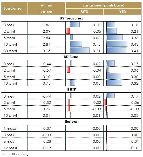 I rendimenti dei principali titoli governativi hanno continuato a salire. Alla base dell’aumento dei rendimenti dei titoli governativi statunitensi c’è la rimodulazione delle aspettative sui futuri rialzi della Fed, ma anche le preoccupazioni per un futuro ampio disavanzo di bilancio negli Stati Uniti. Tali preoccupazioni si sono amplificate dopo la discussione dell’accordo di bilancio bipartisan al Senato. Il piano aggiungerebbe altri 500B di dollari in nuove spese per due anni e sospendere il tetto del debito fino al 2019. E’ importate sottolineare che In settimana diversi esponenti della Fed hanno cercato di calmierare i timori connessi con il marcato sell-off dei mercati azionari e l’aumento della volatilità, segnalando che è improbabile che la Fed modifichi il corso della sua politica, dati i fondamentali forti dell’economia USA. Il presidente uscente della Fed di New York, Dudley (elettore), ha sottolineato che la recente correzione dei mercati azionari non sarà causa di revisione della politica monetaria della Fed. Il presidente della Fed di Dallas, Kaplan, ha osservato che le correzioni del mercato possono essere salutari e che attualmente non vi sono implicazioni negative per i fondamentali dell’economia. A sua volta presidente della Fed di St. Louis ha rimarcato che il recente calo del mercato azionario deve essere letto alla luce delle elevate valutazioni dei titoli tecnologici e che potrebbe trattarsi di una correzione fisiologica. Sui titoli governati europei ha invece pesato l’esito della riunione di politica monetaria della BoE. Giovedì i Gilt 10Y sono saliti 1,62%, il dato più alto da maggio 2016, sulla scia delle attese di un anticipato rialzo da parte della BoE. Anche i rendimenti dei bund sono aumentati con gli investitori che continuano a rivalutare le prospettive di “early tapering” da parte della BCE.