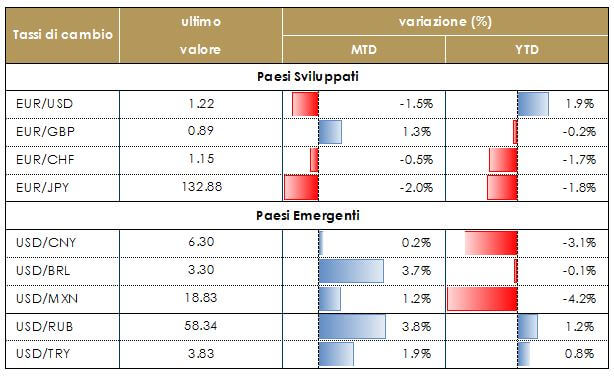 Riteniamo che l’evoluzione della politica fiscale negli Stati Uniti e la rimodulazione delle attese future da parte della Fed guideranno il tasso euro-dollaro fino alla fine dell’anno.