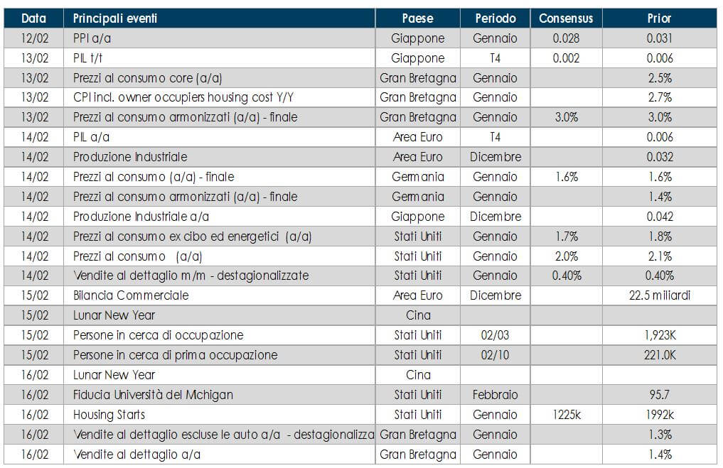 Stati Uniti: inflazione di gennaio sotto i riflettori anche per gli Stati Uniti, insieme a produzione industriale e qualche dato sul mercato immobiliare, tra cui le nuove costruzioni abitative.