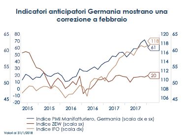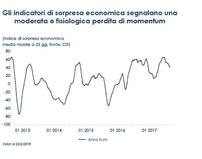 | Questa settimana la pubblicazione relativa al mese di febbraio delle indagini congiunturali per l’Area Euro hanno segnalato una fisiologica e modesta perdita di momentum, contestuale alla flessione dell’indice di sorpresa economica. La stima preliminare dell’indice PMI nell’Area Euro ha registrato un rallentamento fisiologico, attestandosi ai minimi da quattro mesi (59,5), sorprendendo al ribasso le attese (59,2) e passando così da un valore pari al suo massimo a 12 anni (a gennaio 57.5) al minimo da tre mesi. Il calo è stato equamente guidato da entrambe le componenti del PMI, servizi e manifatturiero. L’indice manifatturiero è sceso a 59,5 (-1,6 punti) e quello relativo ai servizi è sceso di 1,3 punti a 56,7, tornando, così, al livello di dicembre. Il rallentamento degli indicatori congiunturali non rappresenta, a nostro avviso, un’inversione di rotta nella congiuntura dell’Area, dove prosegue un’espansione solida e generalizzata, che lascia ipotizzare che la crescita di T1 2018 sarà in linea con quella verificatasi nel 2017. Gli indicatori suggeriscono che, dopo una forte ripresa, l’Area Euro stia raggiungendo un punto di stabilizzazione. Da un lato i nuovi ordini hanno rallentato, sebbene vi siano segnali di una domanda solida (le aziende segnalano un aumento dello stock di lavoro arretrato, una forte creazione di posti di lavoro e limiti di capacità produttiva), dall’altro guardando alle diverse sotto-componenti degli indici PMI vediamo che si mantengono stabilmente sopra la media storica. A livello di singolo paese, le limitate informazioni sulla disaggregazione a livello geografico, mostrano che il PMI composito tedesco e francese sono anch’essi diminuiti, pur restano ad un livello elevato e suggerendo che in entrambi i paesi la crescita del PIL trimestrale resta attorno ai livelli di T4 2017. In Germania sono stati resi disponibili anche le indagini congiunturali dello ZEW e dell’IFO. Il quadro fornito è il medesimo: i dati hanno evidenziato un clima leggermente meno euforico, con un certo indebolimento delle esportazioni, ma non si può parlare di un cambiamento nella tendenza economica. L’indice di fiducia ZEW relativo alla situazione corrente ha corretto da 95,2 punti a 92,3. Ha invece sorpreso al rialzo la componente relativa ai 6 mesi successivi, che scende a 17,8 meno delle attese (16,0 consenso), dai precedenti 20,4. Anche l’indice ZEW relativo alle aspettative a 6 mesi per l’intera Area Euro segna, a febbraio, una modesta correzione a 29,3 punti dai precedenti 31,8. Delude anche l’indice IFO tedesco, che registrato un forte calo a febbraio a 115,4 da 117,6, sulla scia dell’ampio calo della componente delle aspettative a 105,4 rispetto alla previsione 107.8 e la precedente 108. Invece l’indice delle condizioni correnti si stabilizza a 126,3 contro il consenso 127,0 e il precedente 127,7. Anche in Francia, l’indice di fiducia delle imprese si è attestata a 109,1 al disotto delle attese (110) e del dato di gennaio. |