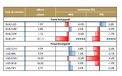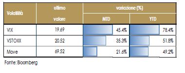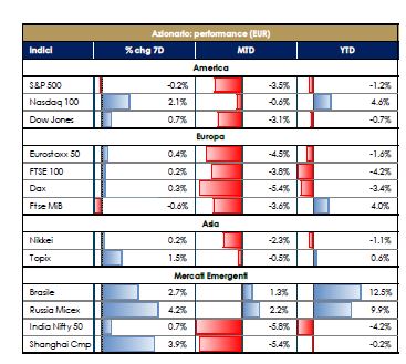 - Europa: attenzione rivolta all’inflazione e all’indice di fiducia economica ESI, elaborato dalla Commissione Europea, che sarà importante per verificare i segnali di moderazione del ciclo emersi questa settimana dalle indagini PMI, IFO e INSEE. Attese anche le vendite al dettaglio in Francia e in Germania.