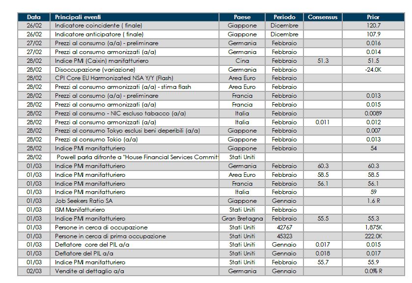 - Stati Uniti: focus sarà sull’audizione di Powell in Congresso per la presentazione del Monetary Policy Report. Relativamente ai dati macroeconomici, l’ISM dovrebbe restare su livelli elevati, gli ordini di beni durevoli al netto dei trasporti dovrebbero proseguire sul trend positivo, come anche le vendite di nuove case. La seconda stima del PIL di T4 2017 dovrebbe essere marginalmente al di sotto della prima lettura, pur confermando una dinamica solida.