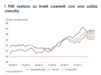 - Nonostante il calo registrato a febbraio, l’indice PMI relativo all’Area Euro resta su livelli coerenti con la stabilizzazione della crescita economica sui livelli raggiunti nel 2017.