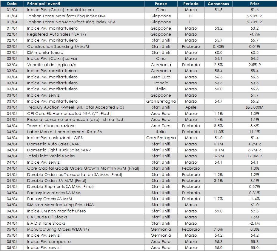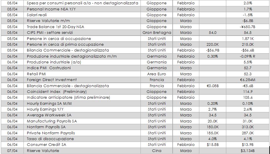 - Stati Uniti: la settimana prossima sarà ricca di dati. Verrà pubblicato il valore dell’indice ISM manifatturiero relativo al mese di marzo, la spesa per costruzioni, le vendite di veicoli ed infine il report sul mercato del lavoro relativo al mese di marzo