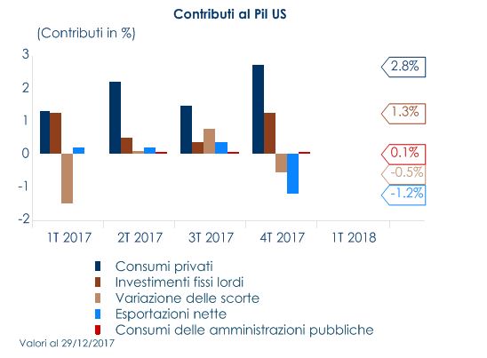 La stima finale del PIL di T4 2017 ha sorpreso positivamente, con una revisione al rialzo della crescita a 2,9% t/t annualizzata, dalla precedente stima al 2,5% t/t annualizzata e contro le attese di una revisione al rialzo di soli due decimi a 2,7% t/t annualizzata. Nello specifico, il rialzo rispetto alla seconda stima è frutto di una revisione inattesa al rialzo dei consumi e di un contributo negativo minore di quanto stimato in precedenza delle scorte. Nel dettaglio, i consumi privati hanno infatti messo a segno una crescita del 4,0% t/t annualizzata, dal 3,8% della stima precedente grazie agli apporti di servizi e beni non durevoli. Gli ordini di beni durevoli, secondo la lettura preliminare di febbraio, sono cresciuti del 3.1% m/m, al di sopra delle attese (1.6%).