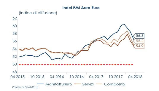 Il PMI manifatturiero dell’Area Euro è stato confermato a 56.6, invariato rispetto alla lettura preliminare e in calo rispetto al valore del mese precedente (58,6). La media di T1 2018, pari a 58.2, è ancora indicativa di una solida crescita. La flessione ha rispecchiato i ritmi più lenti di produzione e le nuove attività in entrata, entrambi al tasso più basso da novembre 2016. I vincoli di capitale hanno inciso sulla produzione, mentre i tempi di consegna dei fornitori sono stati tra i più alti nella storia dell’indagine. La crescita delle esportazioni è stata un ostacolo per le prospettive, essendosi dimezzata rispetto alla fine dello scorso anno a causa dell’apprezzamento dell’euro e dell’aumento dei prezzi. Il PMI dei servizi, invece, in marzo si è attestato a 54.9 in leggero ribasso rispetto alla lettura preliminare (55.0) e in rallentamento rispetto a febbraio (56.2). Conseguentemente, l’indice PMI composito si è attestato in rallentamento rispetto al valore di febbraio (57.1) a 55.2: il rallentamento dell’attività riflette una lieve decelerazione nella crescita di nuovi ordini e le condizioni meteorologiche avverse in alcune regioni settentrionali.