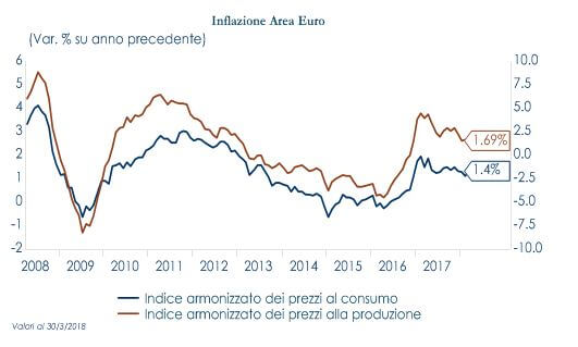 La stima preliminare dell’inflazione aggregata per l’Area Euro a marzo è tornata sui livelli di dicembre, assestandosi a 1,4% dopo il calo a 1,1% registrato a febbraio. Come atteso, il recupero è stato spinto significativamente dall’esaurirsi dell’effetto base negativo del mese di febbraio relativo ai prezzi di alimentari e tabacco. Il dato core ha, invece, deluso le attese, mantenendosi invariato a 1,0%, contro attese di un modesto aumento a 1,1%. Nel complesso, dunque, le stime preliminari confermano una ripresa nel tasso di crescita dei prezzi al consumo dopo i minimi di febbraio che tuttavia non fornisce uno stimolo significativo ad un trend sottostante alla crescita dei prezzi che, come ribadito anche dalla BCE, rimane ancora contenuto. L’indice dei prezzi alla produzione dell’Area Euro è cresciuto a febbraio dello 0,1% m/m, in linea con le attese di sostanziale stabilità, mentre la crescita su base annua si è assestata a 1,69%.