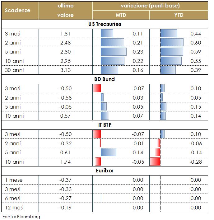 Da inizio anno, il tasso Libor a tre mesi è salito al livello più alto dal 2009, a oltre 100 pb sopra la media del 2017. Conseguentemente, si è allargato lo spread Libor-OIS (il differenziale tra i tassi sui depositi interbancari privi di garanzia a breve termine e i tassi sui depositi Overnight Indexed Swaps), tornando a livelli non più osservati dalla crisi del debito sovrano. In questo contesto, i mercati si stanno interrogando su cosa sia alla base di questo allargamento e se questo vada letto come un sintomo di stress del sistema bancario, parafrasando le parole usate dall’ex-governatore della Fed, Alan Greenspan, che vedeva lo spread Libor-OIS come “un barometro della paura dei fallimenti bancari”. Storicamente, un allargamento sproporzionato dello spread Libor-OIS ha segnalato un progressivo aumento della rischiosità del sistema bancario (dovuto alla scarsità del credito o alla difficoltà di funding), ma attualmente questo allargamento è il risultato di uno squilibrio tecnico tra domanda e offerta negli Stati Uniti (strettamente connesso con la riforma fiscale degli Stati Uniti di fine 2017) e non è né espressione di una disfunzione del sistema bancario statunitense, né un fenomeno sistemico. Infatti, da un lato l’aumento del tasso Libor, e il conseguente l’allargamento dello spread Libor-OIS, è attualmente limitato agli Stati Uniti e non coinvolge i paesi dall’altra sponda dell’Atlantico (Area Euro e Gran Bretagna), dall’altro è facile constatare che gli altri indicatori di rischio non sono aumentati in ugual misura. Infatti, il recente aumento del Libor in USD non è stato associato a un più negativo cross-currency basis rispetto all’USD, suggerendo che questo non è un problema sistemico di finanziamento in USD, mentre i CDS sui titoli bancari, pur essendo lievemente aumentati nelle ultime settimane, non hanno raggiuto i livelli dei passati periodi di turbolenza. Due aspetti tecnici hanno innescato questo allargamento dello spread Libor-OIS: in primo luogo, l’aumento dell’emissione di buoni del Tesoro a breve termine, in secondo luogo la recente riforma fiscale statunitense. A inizio febbraio, dopo il blocco delle attività amministrative da parte del Congresso degli Stati Uniti e dopo due mesi in cui le emissioni sono state pressoché invariate, il Tesoro ha collocato una quantità rilevante di buoni del tesoro a breve termine.La recente riforma fiscale statunitense ha ridisegnato la tassazione degli utili all’estero e la deducibilità degli interessi maturati dalle imprese, modificando gli incentivi ad indebitarsi per le aziende multinazionali. Con l’operazione di rimpatrio dei capitali e il passaggio alla tassazione territoriale degli utili, mediante l’introduzione della clausola anti-elusione BEAT (“The Base-Erosion and anti abuse tax”), sono stati modificati gli incentivi delle multinazionali a rimpatriare il profitti detenuti all’estero: la nuova normativa elimina l’incentivo per le multinazionali a mantenere permanentemente all’estero i profitti maturati all’estero, che una volta rimpatriati sono tassati con un’aliquota ridotta, rendendo le multinazionali più libere di usare i loro fondi senza temere conseguenze fiscali negative. La nuova normativa sta cambiando le abitudini delle multinazionali nella gestione della loro raccolta e dei loro finanziamenti a breve termine, guidando il recente allargamento dello spread. Infatti, questa maggior libertà ha indotto a reinvestire parte dei profitti in strumenti a breve termine (T-Bill e corporate debt). Al contempo la riforma fiscale ha diminuito le deduzioni sugli interessi maturati sui debiti contratti da imprese e persone e, quindi, la possibilità per le multinazionali di dedurre gli interessi pagati alle succursali estere. Le multinazionali statunitensi ora si affidano meno a prestiti provenienti dalle succursali estere e più ai prestiti variabili con le controparti estere, (prezzati con i tassi Libor), aumentandone la domanda. Quindi, la BEAT da un lato incentiva alcune imprese ad emettere più debito a breve termine, dall’altro porta alcune multinazionali a ridurre la loro domanda di debito a breve. Si è assistito così ad un aumento nell’emissione di T-Bill e di debito a breve ed ad una contestuale riduzione della domanda, che sono sfociati in un allargamento dello spread Libor-OIS.Le domande che si pongono gli operatori di mercato sono tre: lo spread Libor-OIS continuerà ad allargarsi o ha raggiunto un livello su cui dovrebbe stabilizzarsi? vi sarà un contagio sistemico anche verso altre valute? quale sarà l’effetto sul costo del credito negli Stati Uniti? Da un lato, la maggior emissioni di titoli del Tesoro è temporanea (solitamente l‘offerta di T-Bill si stabilizza in aprile, quando il tesoro inizia a riscuotere i pagamenti delle tasse), ma la recente riforma fiscale ha introdotto un cambiamento strutturale e non temporaneo nella domanda e offerta di fondi a breve termine, perciò riteniamo che non dovremmo osservare un ulteriore allargamento dello spread e non ci aspettiamo un suo rintracciamento nel breve periodo. Allo stesso tempo, questo aumento dello spread si traduce in un ulteriore aumento dei tassi di interesse a breve termine e si va da aggiungere agli aumenti del costo del denaro decisi dalla Fed, contribuendo a inasprire le condizioni finanziarie, in quanto molto contratti e molti strumenti di finanziamento sono indicizzati al tasso Libor. L’effetto sulle condizioni finanziarie dipenderà da come questo allargamento dello spread si propagherà lungo la struttura a termine. Infatti, andando a guardare i moltiplicatori della funzione di reazione del consumatore americano rispetto ari tassi di interesse, essa è maggiormente impattata dalle scadenze a medio lungo termine della struttura a termine che non dai tassi a breve termine. LA SETTIMANA TRASCORSA