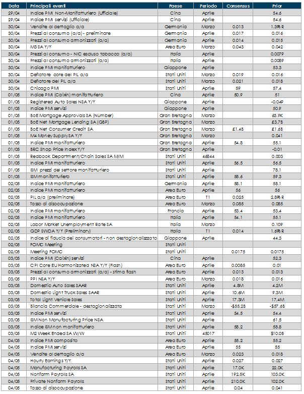 L’indice ISM manifatturiero ha ritracciato dal livello di febbraio attestandosi a 59.3, mentre la componente non manifatturiera si è attestata a 59.5, sopra le attese (59). A marzo il report ADP dei nuovi occupati per le imprese private ha sorpreso al rialzo, assestandosi a 241 mila unità contro le 210 mila attese e dopo le 246 mila unità del mese precedente (riviste al rialzo da 235 mila). Le nuove richieste di sussidi di disoccupazione per la quinta settimana di marzo sono cresciute oltre le aspettative da 218 mila a 242 mila unità (225 mila consenso). Al contrario, le richieste continuative di sussidi di disoccupazione relative alla quarta settimana sono scese ampiamente oltre le aspettative da 1.872 mila a 1.808 mila unità (1.843 consenso). Sul fronte del commercio internazionale, il deficit di bilancia commerciale a febbraio ha sorpreso negativamente crescendo da 56,7 a 57,6 miliardi (consenso:56,8). I dati sullo scambio di merci sono sostanzialmente in linea con quanto riportato nel rapporto sul commercio, pubblicato la scorsa settimana, con le esportazioni di beni in rialzo del 2,3% dopo un calo del 2,5% in gennaio e le importazioni di beni in aumento dell’1,7%, dopo il -0,1% a gennaio. Le importazioni di alimenti, mangimi e bevande, forniture industriali e beni strumentali sono state le più alte mai registrate, il che ha contribuito a spingere le importazioni totali di beni di febbraio al livello più alto mai registrato (212,5 miliardi di dollari). Per quanto riguarda i servizi, le esportazioni di servizi sono aumentate dello 0,7% e le importazioni di servizi sono aumentate del 2,3%, sostenute da un aumento del 23% delle spese per l’uso della proprietà intellettuale. Il report sul mercato del lavoro relativo al mese di marzo ha mostrato un numero di buste paga non agricole in calo a 103mila al di sotto delle attese (185mila) e ben al di sotto della revisione del mese scorso 326 mila (da 313 mila). Tuttavia, i due mesi precedenti sono stati rivisti al ribasso di 50.000, a 176 mila da 239 mila. I salari medi orari sono saliti di un + 0,3% m/m in linea con le attese, portando il tasso annualizzato 2,7% in aumento dal 2,6% di febbraio. Gli incrementi salariali a livello di industria sono stati più bilanciati, coerentemente con un graduale ampliamento delle pressioni salariali che dovrebbero contribuire a portare i guadagni orari medi al 3,0% a/a entro la metà di T3. Il tasso di disoccupazione si è stabilizzato al 4,1% per il sesto mese consecutivo, superiore alla stima del 4,0%.