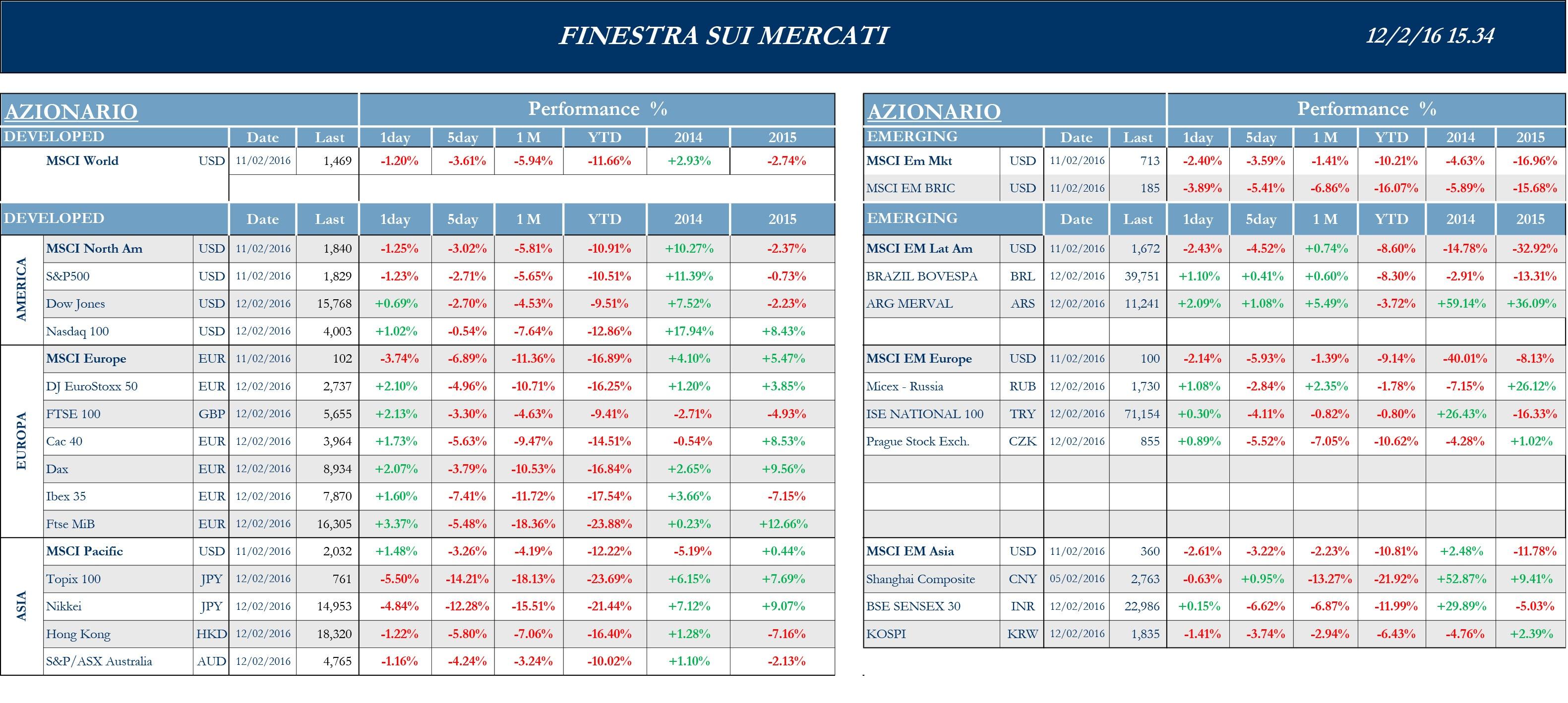 Per quanto riguarda i dati macro provenienti dal Giappone, non riescono a sostenere i mercati i numeri della bilancia delle partite correnti di dicembre:, pur mostrando un surplus per il diciottesimo mese consecutivo, principalmente grazie ai prezzi crollati per le importazioni di energia, i valori si collocano sotto le attese degli analisti con un valore di ¥ 961mld rispetto ai ¥ 1,051 attesi e calando dai ¥1,144 di novembre 2015. Pesano anche i valori dei prezzi alla produzione, che non riescono a scongiurare il pericolo deflazione, portandosi a gennaio al -3.1% rispetto al -2.8% atteso e poco in ripresa dal -3.4% di dicembre 2015. A fine settimana, preoccupato dai ribassi, il ministro delle Finanze giapponese Taro Aso ha dichiarato come Tokyo sia disposta a rispondere alla volatilità dei mercati con misure straordinarie, dopo che la decisione di tassi d’interesse negativi non ha prodotto gli effetti sperati e il continuo rafforzamento dello Yen ha penalizzato le società esportatrici nipponiche e i loro titoli. Si è espresso su temi di politica monetaria anche il governatore della banca centrale australiana Glenn Stevens, secondo cui il paese avrebbe la possibilità di allentare ulteriormente la politica monetaria se necessario. Nonostante la chiusura delle piazze cinesi, permangono intanto i timori sulla reale solidità dell’economia cinese: come riportato da Bloomberg, Kyle Bass, l’hedge fund manager che aveva scommesso contro i mutui subprime, sostiene che il sistema bancario cinese possa dovere affrontare una crisi ben superiore a quella americana, costringendo così il governo centrale di Pechino a una ricapitalizzazione di circa 10 trln di Yuan.