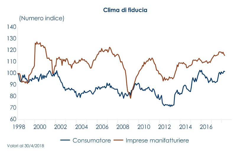 Nell’Area Euro, l’indicatore di fiducia economica ESI è diminuito a 112,5 in maggio (rispetto a un consenso 112,1 e un valore precedente di 112,7). La scomposizione per componenti ha confermato che la fiducia dei consumatori si è deteriorata a maggio, al pari della fiducia delle imprese nei settori dell’industria e dei servizi. Guardando alla scomposizione per paesi, la fiducia complessiva si è deteriorata in Francia, Italia e Spagna, mentre è rimasta praticamente invariata in Germania. Si noti che il sondaggio è stato condotto prima delle ultime turbolenze in Italia. L’inflazione dell’Area Euro è balzata a 1,9% (consenso: 1,6%, valore precedente: 1,2%), registrando la variazione più alta da più di un anno. La scomposizione del dato mostra che il maggior contributo è venuto dalla componente energetica. L’inflazione core si attesta a 1.1% (consenso: 1,0%, valore precedente: 0,7%). Il numero potrebbe rafforzare le aspettative di una riduzione graduale del piano di acquisto da parte della BCE. In Germania, le vendite al dettaglio tedesche sono aumentate ad aprile (2,3% m/m, consenso 0,5% m/m, valore precedente -0,3% m/m a marzo). Sempre in Germania, l’occupazione è aumentata di 35k in aprile (+1,4% a/a) e gli stipendi negoziati collettivamente sono aumentati del 2,5% a/a in T1(valore precedente T4 2017: 5% a/a). Sul dato hanno influito effetti stagionali legati al calendario della Pasqua. Nel medio termine, ci aspettiamo che il robusto mercato del lavoro e l’accelerazione della crescita dei salari continuino a stimolare la domanda e stabilizzino la crescita. La disoccupazione è diminuita di 11 mila unità a maggio (consenso: -10k). La caduta è stata superiore ai precedenti 8K di aprile, ma ancora al di sotto della media mensile di 16k registrata da inizio anno. Il tasso di disoccupazione è sceso al 5,2%, nuovo record al ribasso post-riunificazione. L’inflazione preliminare tedesca di maggio sorprende al rialzo, mostrando una crescita della misura nazionale dello 0,5% m/m (consenso: 0,3%) che porta l’inflazione al 2,2% (consenso: 1,9%) dall’1,6% di aprile. Il dato armonizzato vede invece una salita dell’indice del +0,6% m/m (consenso: 0,3%) e l’inflazione attestarsi al 2,2% (consenso: 1,8%) dall’1,4% di aprile.
