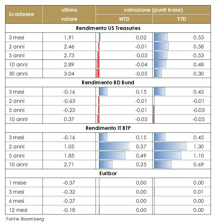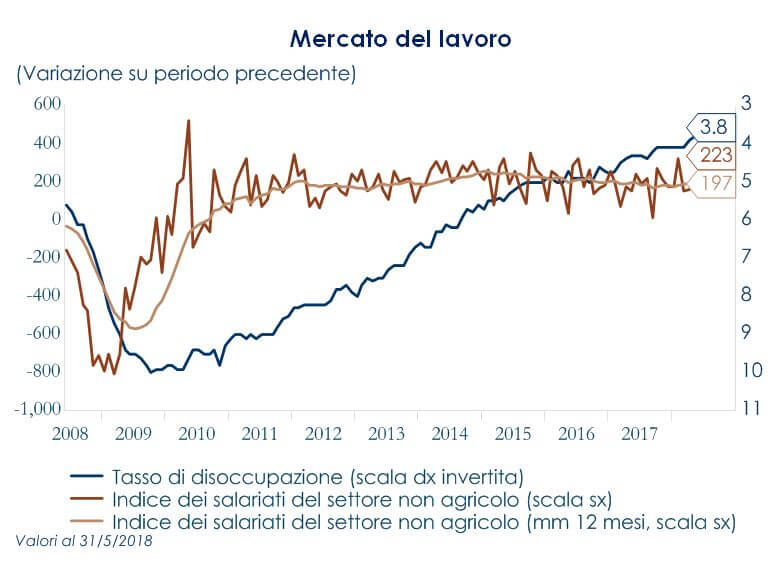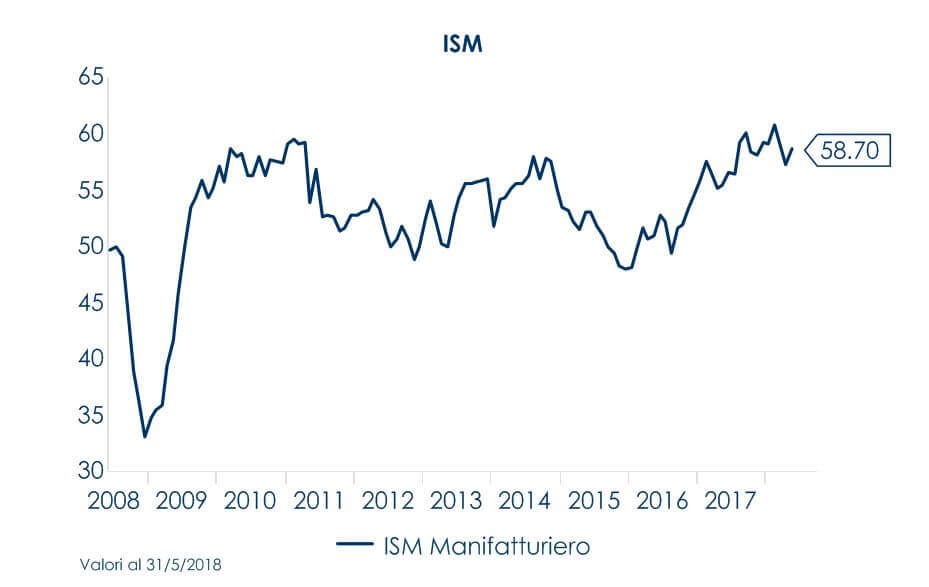 A maggio, la fiducia dei consumatori è arrivata a 128,0, in linea con il consenso, ma migliore rispetto al livello di 125,6, toccando così il valore più alto degli ultimi tre mesi. La valutazione delle condizioni attuali è migliorata su base mensile (38,4% vs aprile 34,8%), mentre il 12% dei consumatori ha valutato le condizioni come negative (in calo dal 12,3% precedente). La percentuale di coloro che vedono i posti di lavoro in crescita sono saliti al 42,4% rispetto al precedente 38,2%, ma quelli che giudicano “difficile ottenerli” sono saliti al 15,8% dal 15,5%. I consumatori sono moderatamente più positivi rispetto alle prospettive a breve termine, tuttavia si registra una diminuzione delle persone in cerca di lavoro. Anche le indagini ADP del settore privato mostrano segni di miglioramento nel mercato del lavoro pur se inferiori alle attese. Il labor report ufficiale riferito al mese di maggio conferma tali statistiche: i nuovi occupati del settore non agricolo salgono di 223k unità da un precedente 164k; la disoccupazione scende al 3,8% dal 3,9% e i salari medi orari registrano un incremento del 2,7% a/a dal precedente 2,6%. L’ISM Manifatturiero del mese di maggio, contribuisce ad alimentare il clima di fiducia, raggiungendo quota 58,7 e sostenendo così le aspettative di crescita anche per la parte centrale dell’anno.