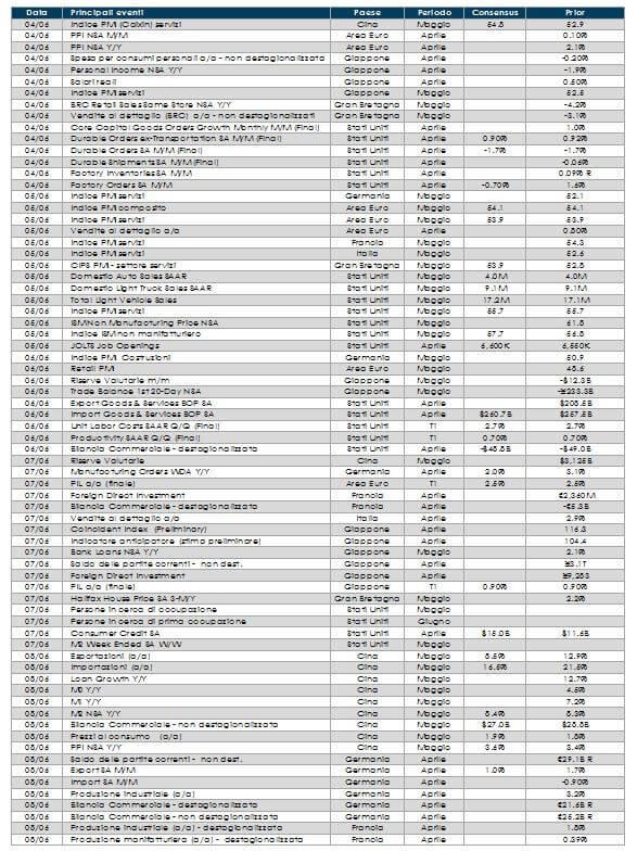 - Asia: settimana ricca di dati in Cina, mentre saranno pubblicati gli indicatori anticipatori in Giappone