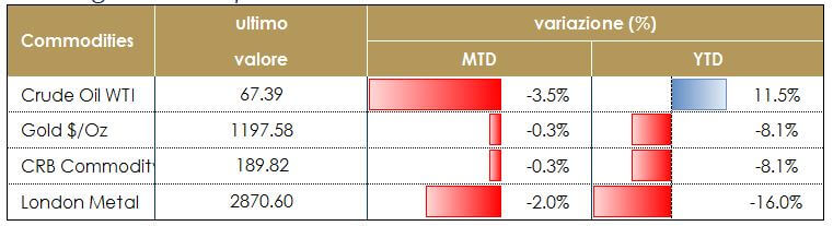Il dollaro si stabilizza dopo la pubblicazione del dato sul mercato del lavoro americano. Yen e franco svizzero beneficiano ancora delle preoccupazioni legate ad un eventuale intensificarsi delle tensioni tariffarie anche se sulla valuta giapponese pesa il futuro esito delle trattative con gli USA circa la questione dello sbilancio commerciale fra i due paesi. La sterlina britannica continua ad essere sottoposta a nuove pressioni all’avvicinarsi delle scadenze relative al processo della Brexit in mancanza di una direzione chiara delle trattative. In settimana la sterlina si è avvantaggiata di un maggior ottimismo dopo che il partito tedesco CSU ha espresso la volontà di mantenere solidi rapporti economici con il Regno Unito anche in seguito alla sua uscita dall’Unione Europea. |